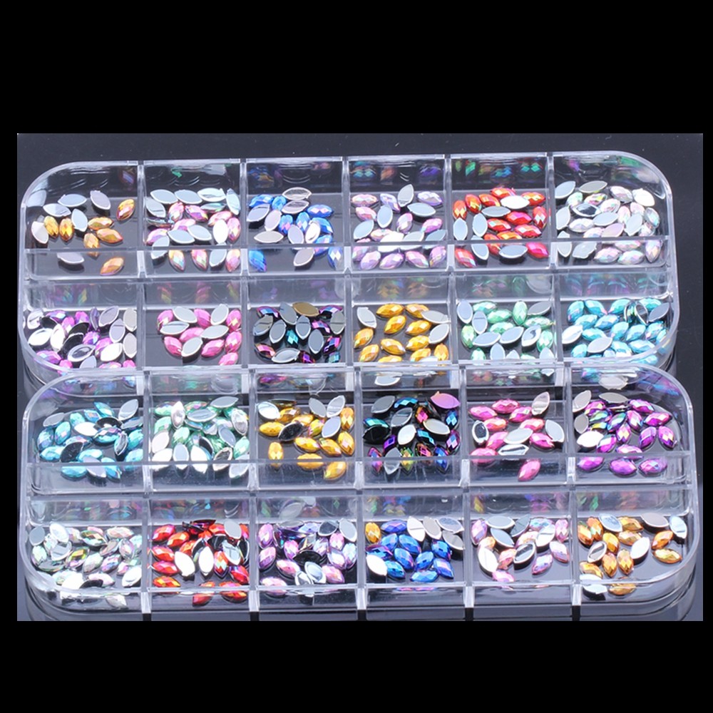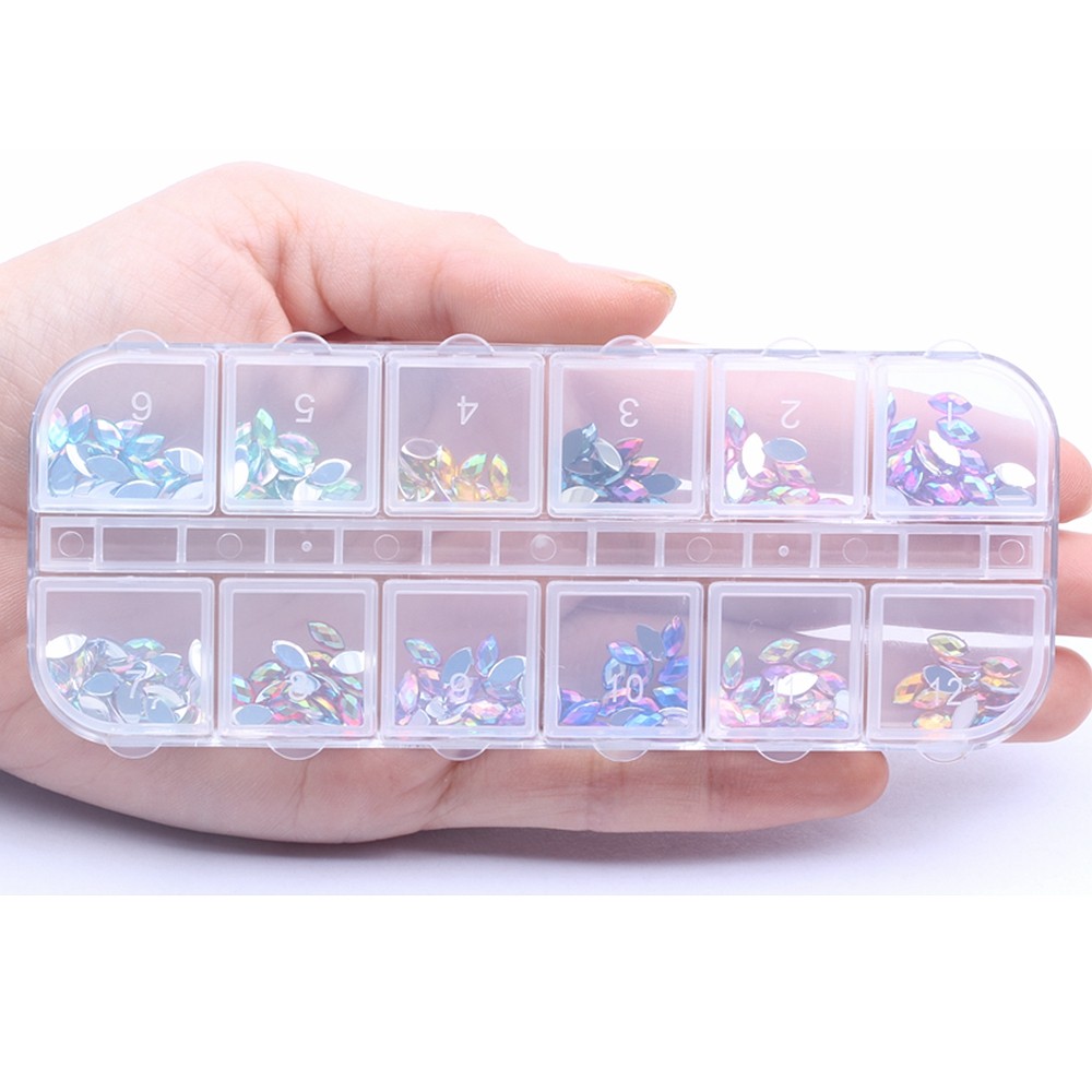 产品特点:包装方法是十二格盒装,颜色选择多,支持定制。相比之前袋装不容易散掉,盒子可以重复使用,水钻每个颜色分开装,使用更便捷,3*6mm小钻,适合美甲装饰。