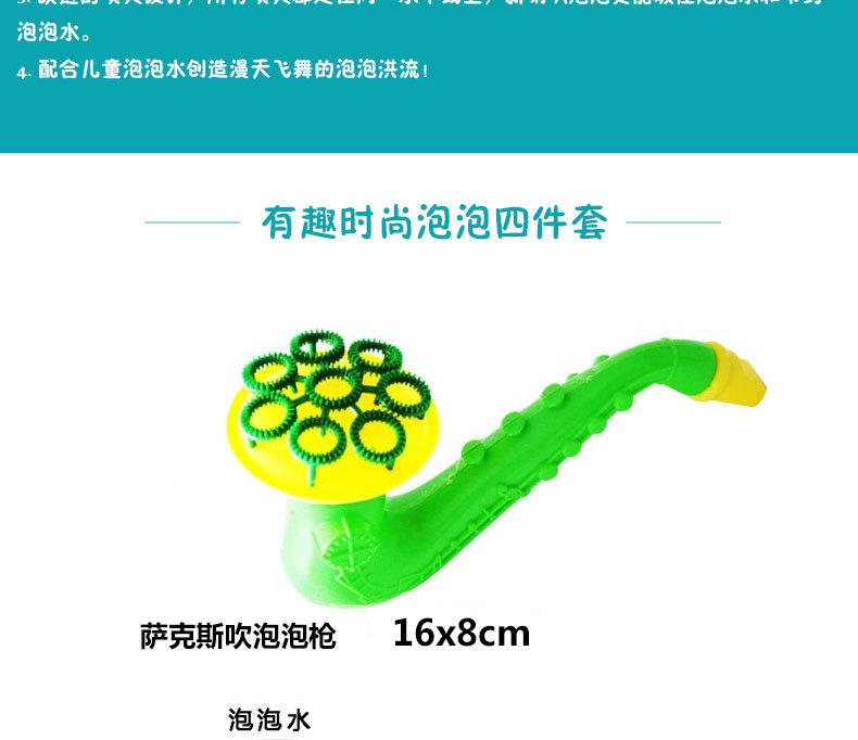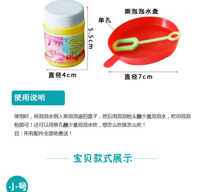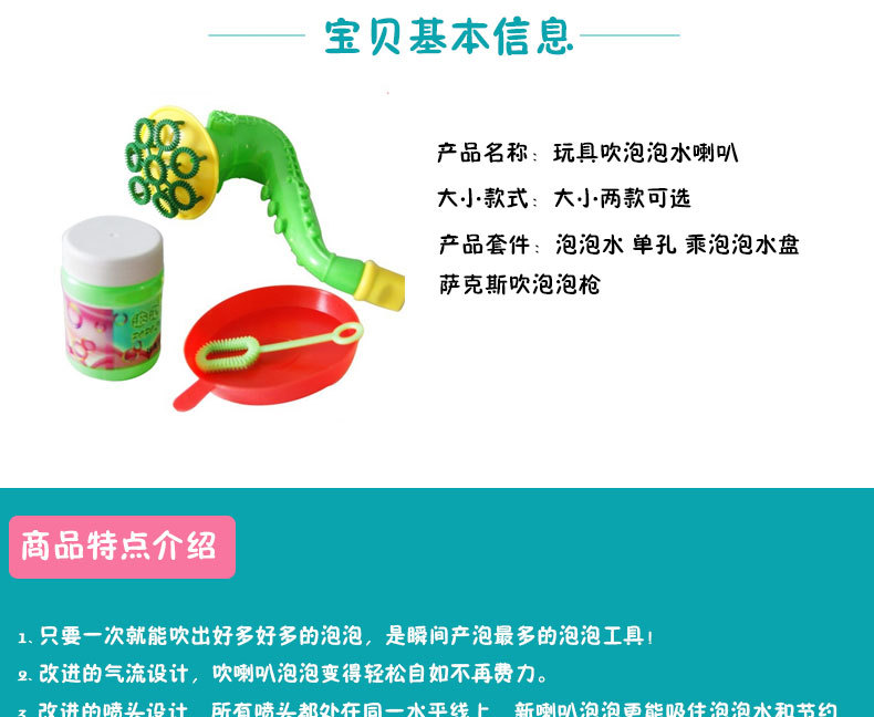 商品特点:自带1瓶泡泡水,今天我们要隆重推荐这一款吹起的喇叭泡泡枪,如果你的宝宝特别喜欢密集多的泡泡,不容错过本款!亲们可以百度一下:泡泡水制作方法,有很多可以参考的小方法的哦!!!