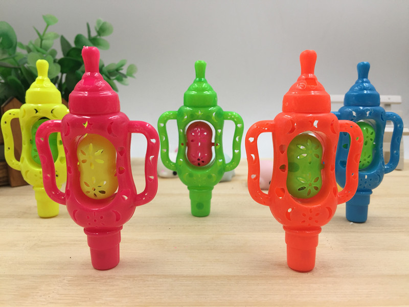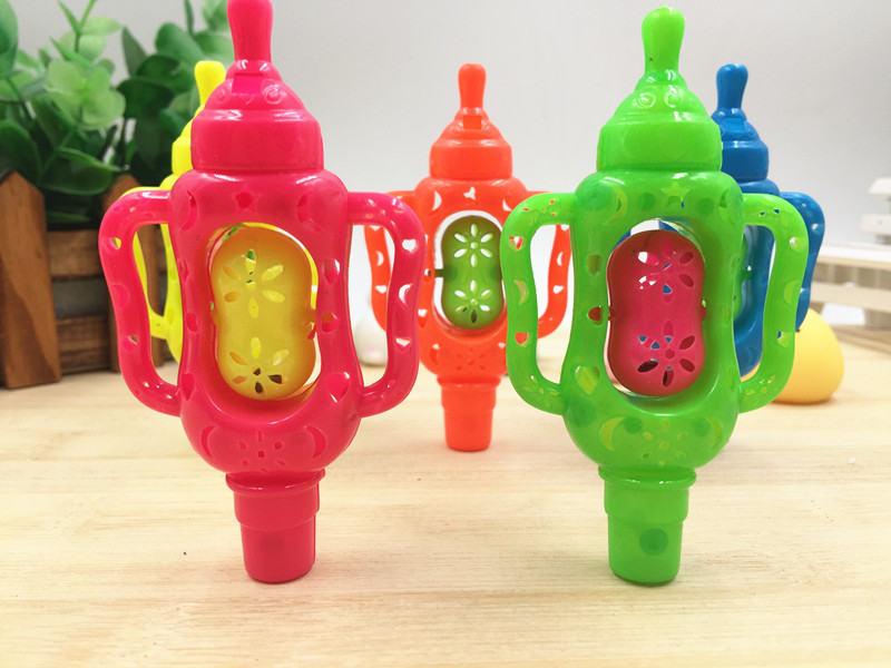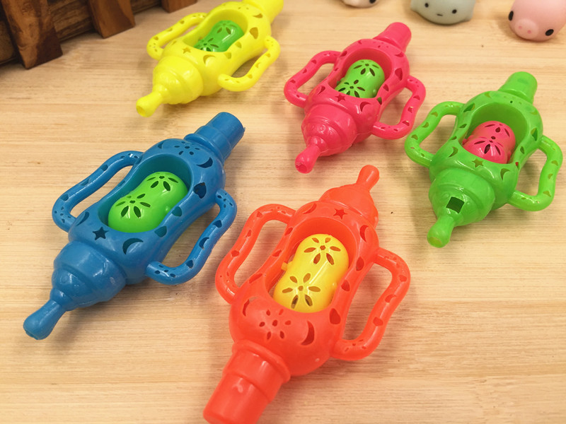 商品特点:彩色塑料的奶瓶口哨玩具造型,好看,声音大,经常练习可以有效的提高宝宝的肺活量和对声音的听力作用,能有效的促进宝宝的智力发展,锻炼宝宝肺活量的好玩具!!!