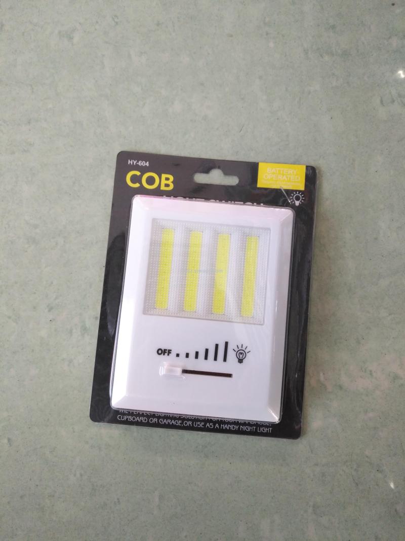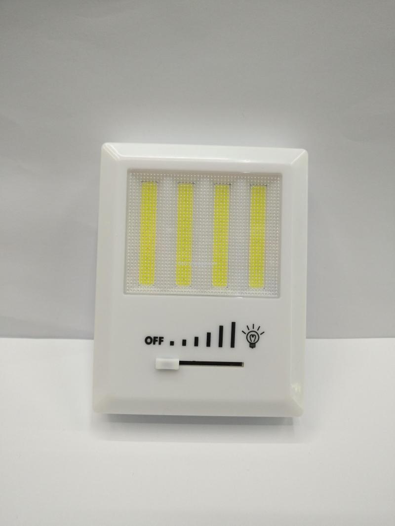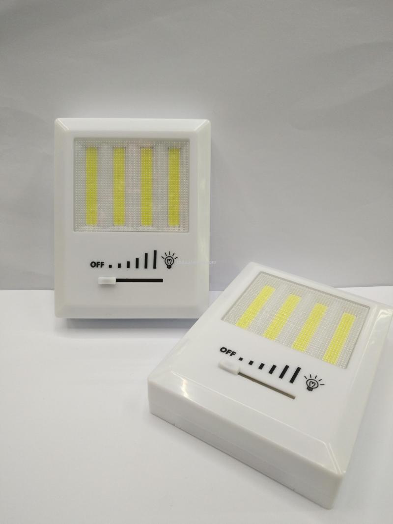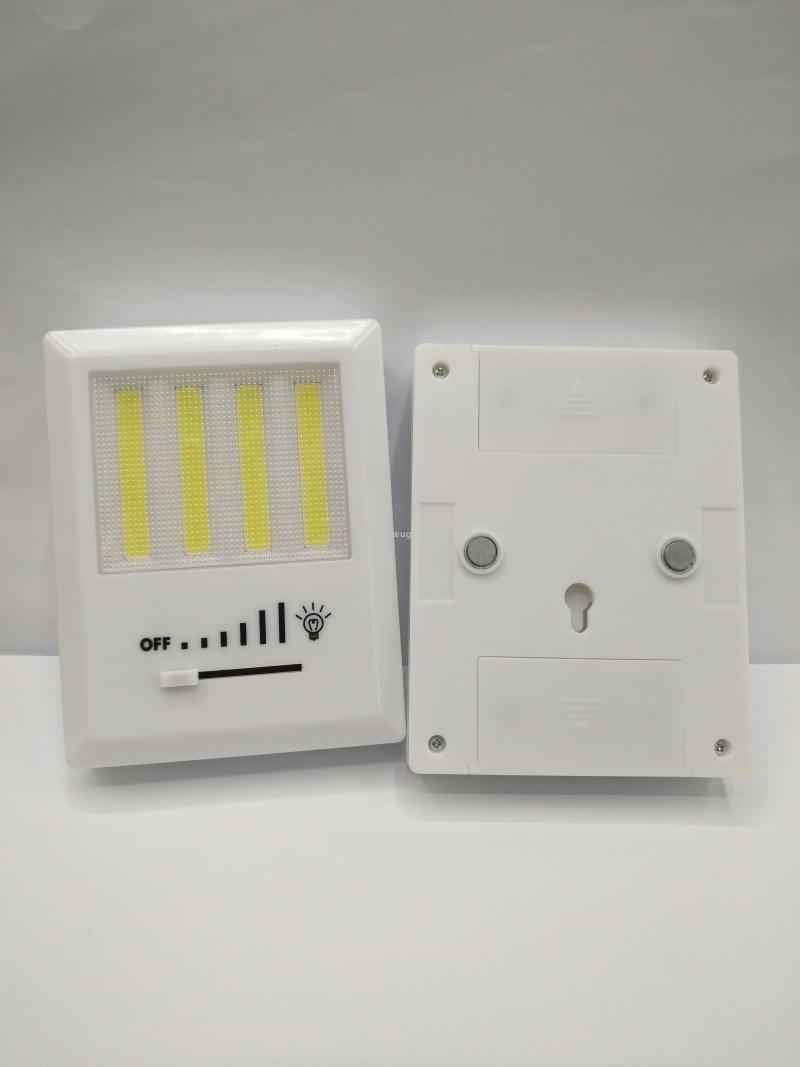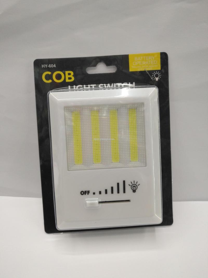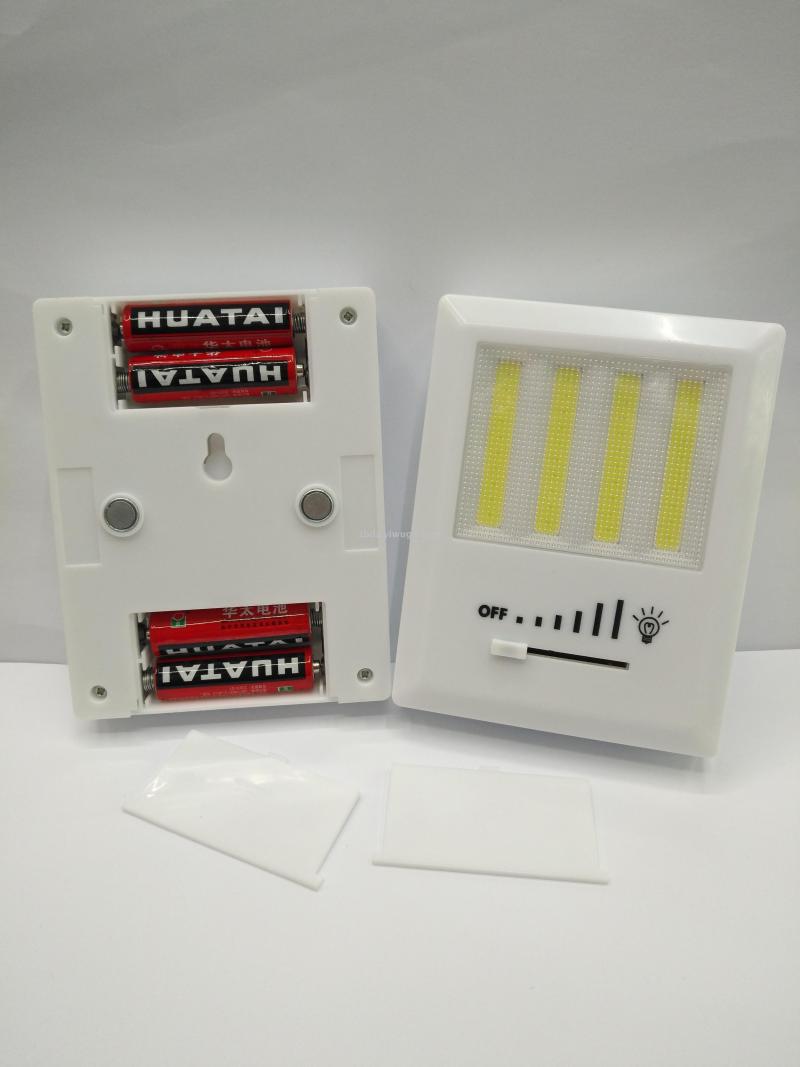 热销COB开关灯床头灯小夜灯,塑料外壳4条COB强光灯珠使用4个AA电池,背面带磁铁双面胶和挂孔,展示盒或单独插卡包装每箱120-180PCS