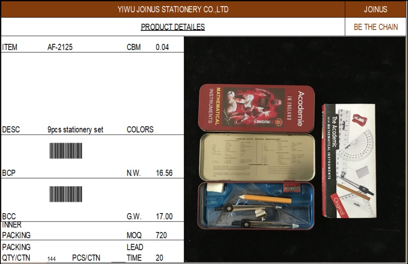 9件套文具套装铅笔盒文具盒  math set Oxford Compass AF-2125