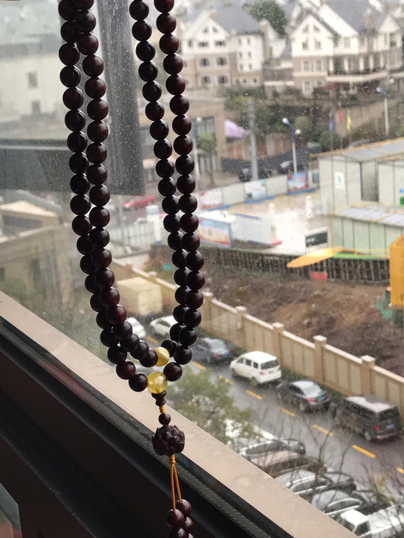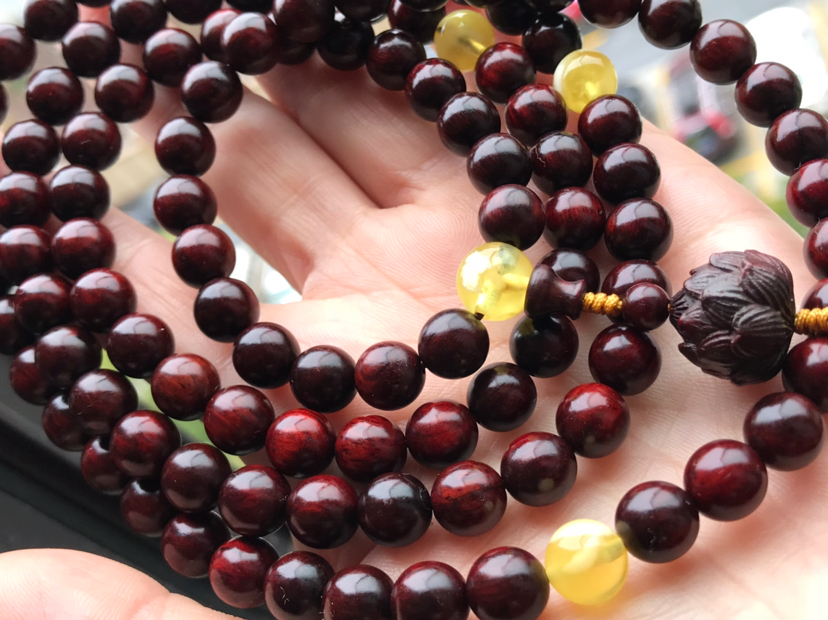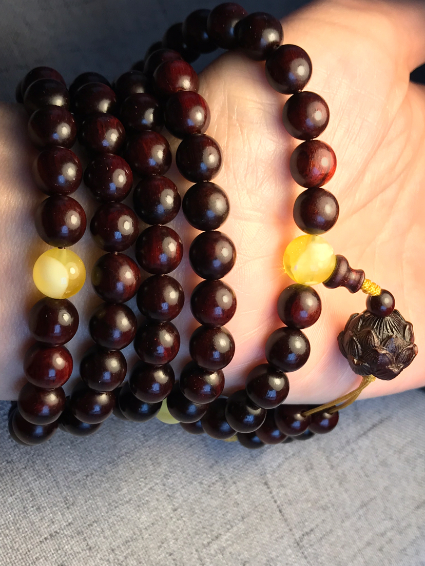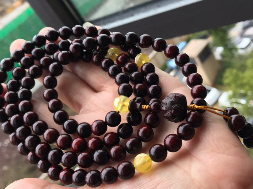紫檀烟环绕,烛花落年少~~~ ??????印度小叶紫檀佛珠,尺寸约8mm*108颗,搭配天然蜜蜡,小叶紫檀莲花背云,无棕眼,带金星,油性十足