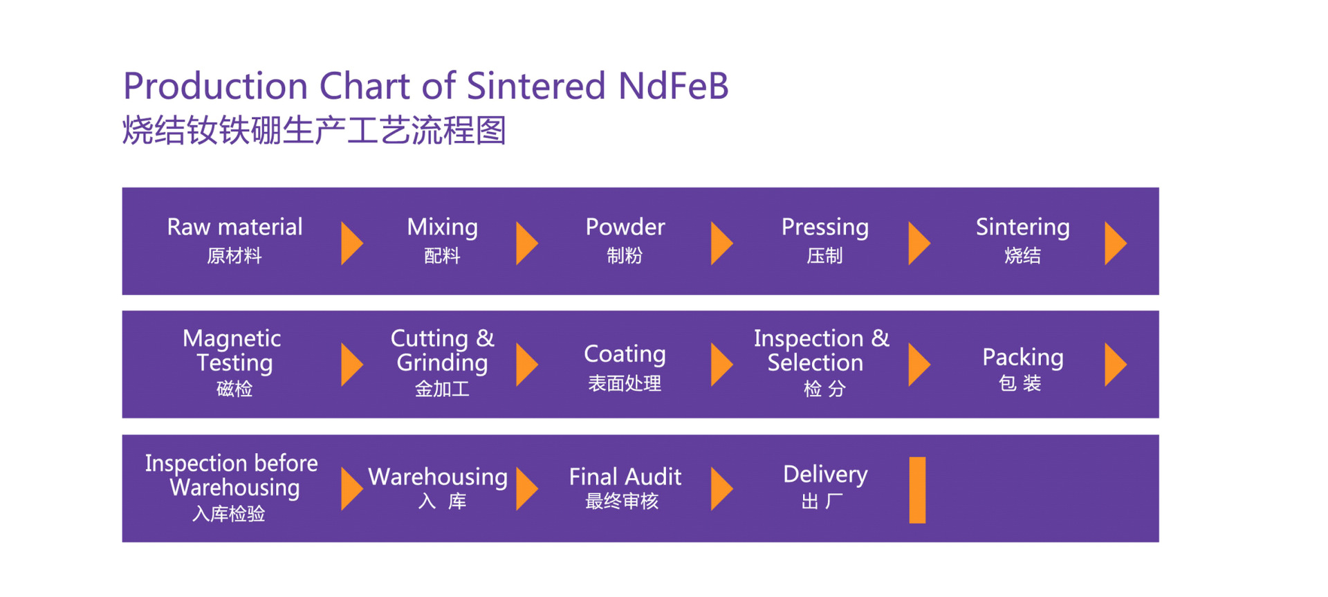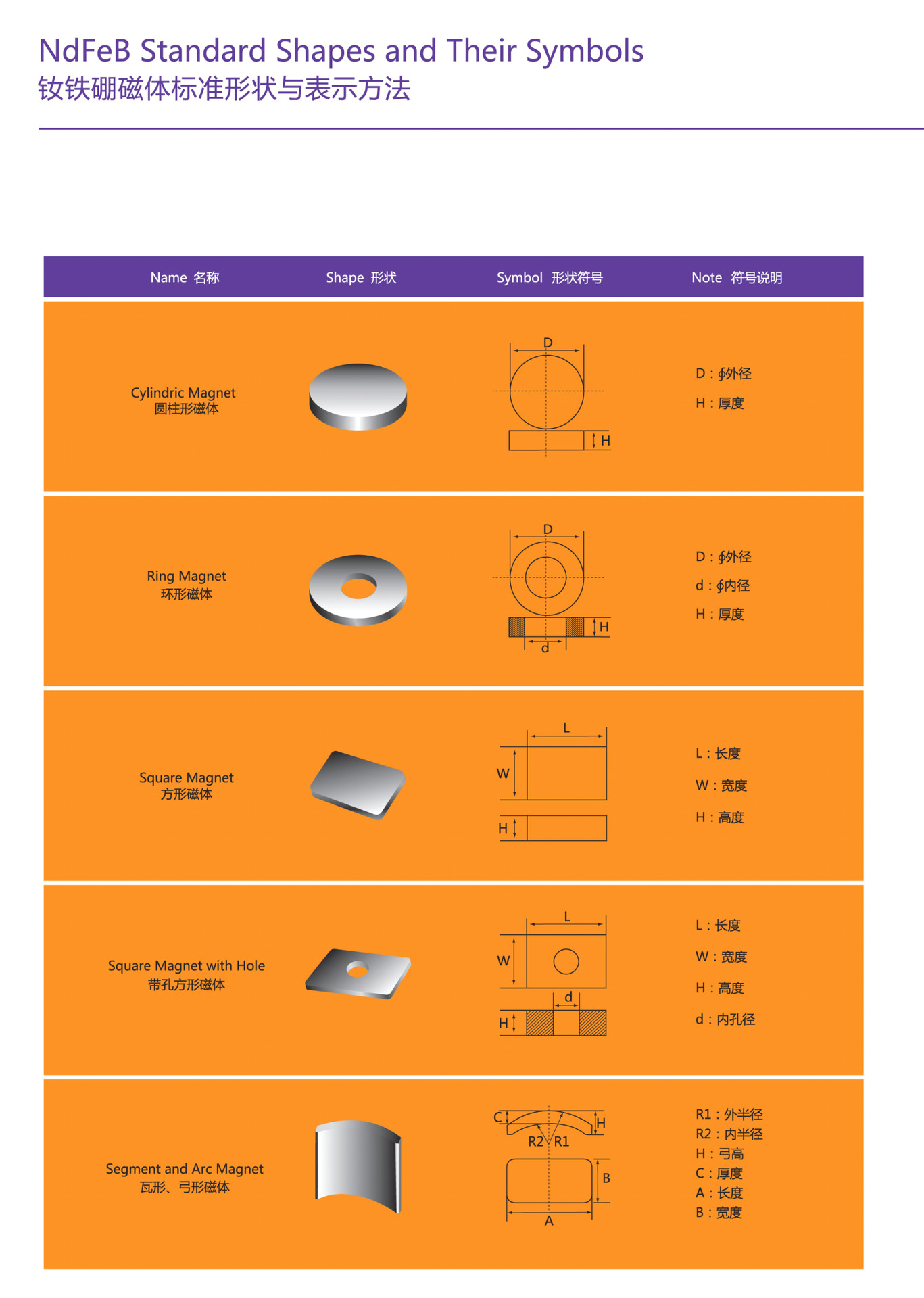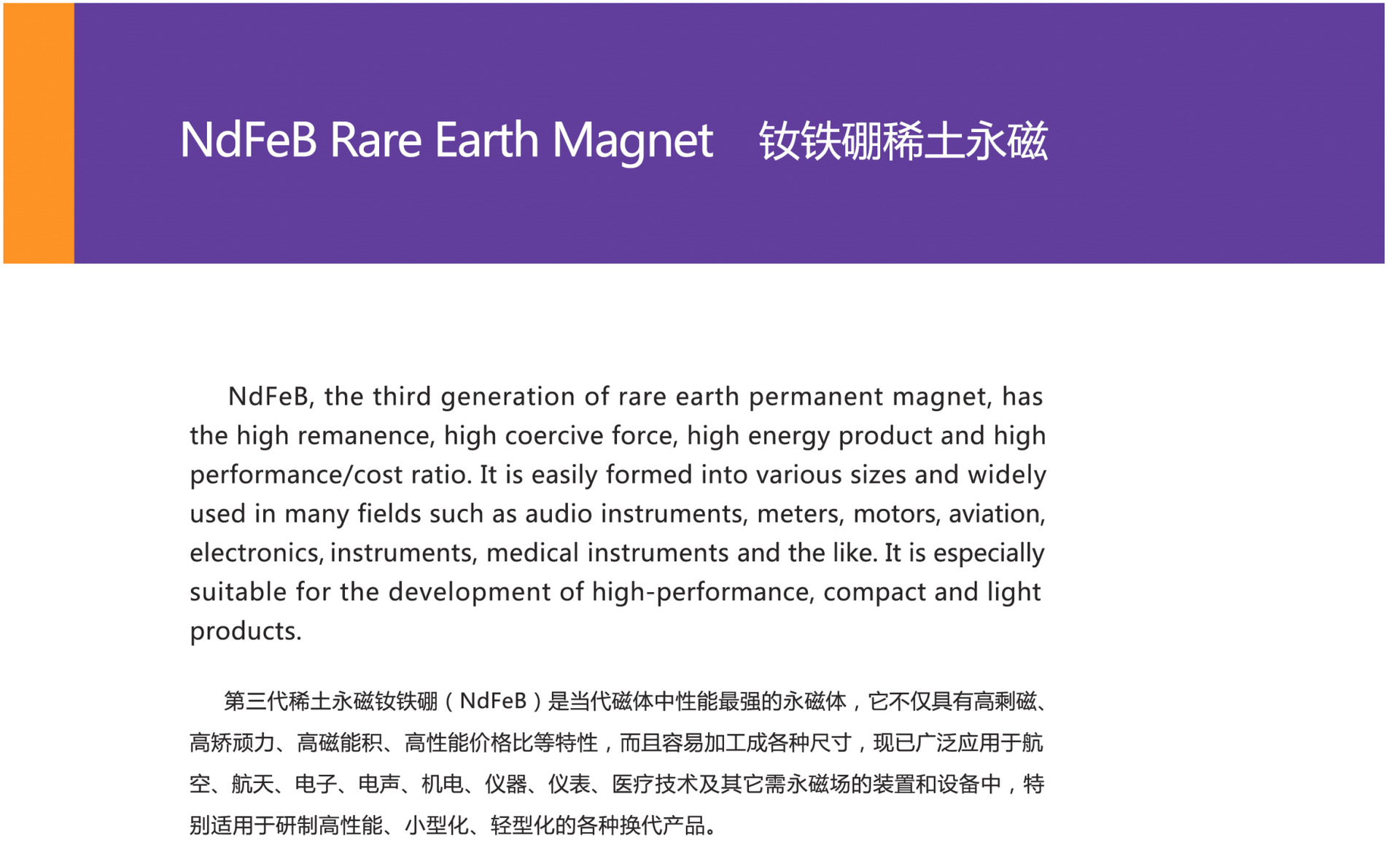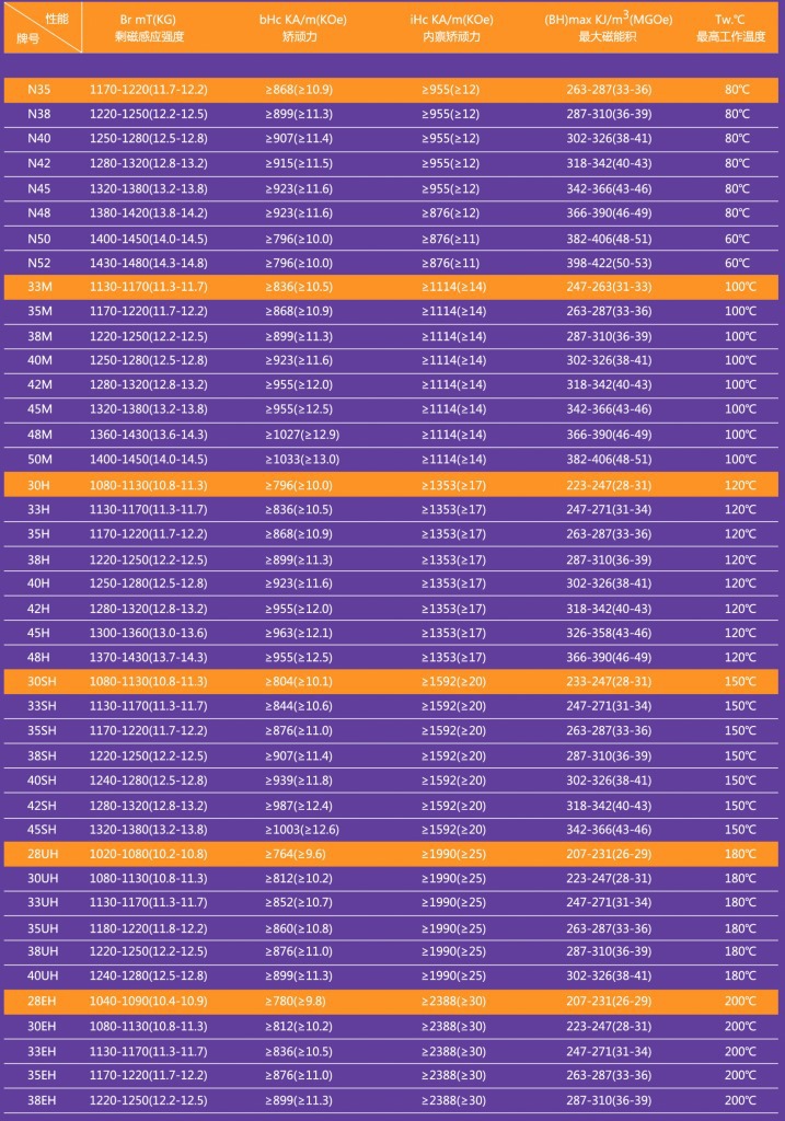 公司产品主要用于各种类型的扬声器、电机、受话器、玩具、医疗器械、磁化器、印刷、灯饰、家具。 产品性能有:N35、N38、N40、N42、N45、N48、N50、N52,磁铁最高工作温度:80°~230°,牌号:N、M、H、SH、UH、EH、VH等。形状:方形、圆形、打孔、跑道、以及异形等形状。镀层:镀锌(ZN)、镀镍(Ni)、镀铜镍(NCN)、镀金(AN)、环氧(Epoxy)等,根据客户的不同需求来订做生产。