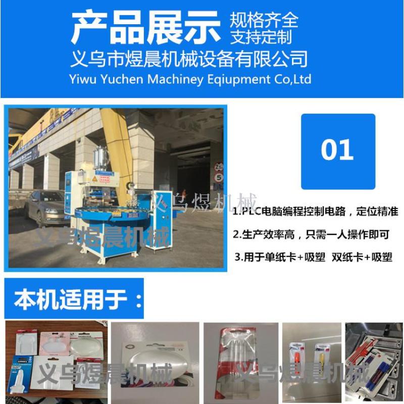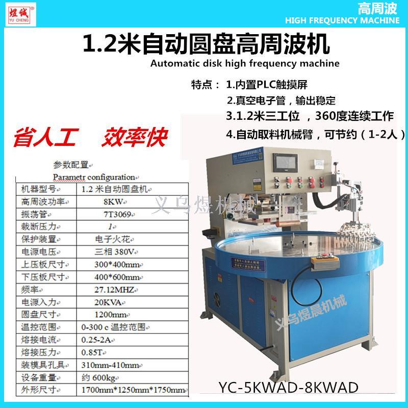 自动转盘高周波熔接机采用高精度分割器设计,位置准确灵活,配有自动取料系统,不会因操作熟练程度而降低品质及安全生。人工放产品,自动取产品双边同时工作,生产效率提高,本机有过流,高灵敏度火花双重保护,当电流超过限定值时,过负载电流继电器自动切断高压,保护振荡管。当模具与产品产生火花时,高感度火花保护装置能及时有效地抑制火花的产生,更好的保护模具及产品。气动机械手取产品,更稳定,效率更高更人性化