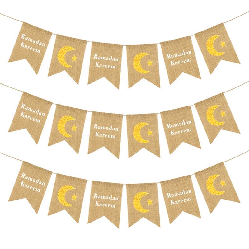 名称:RAMADAN KAREEM燕尾旗 颜色: 亚麻色 材质:亚麻布,麻绳 规格:绳长2.5m 单面旗尺寸:13*18cm,净重:45g 产品特点: 欧美穆斯林布置,可用于户外室内的顶棚装饰,指引装饰,美轮美奂。常年出口亚非、欧美各国,欢迎来样定做,具体联系客服 温馨提示:可以定制各种麻布三角旗、燕尾旗、桌旗、插旗、指引旗、椅旗等等
