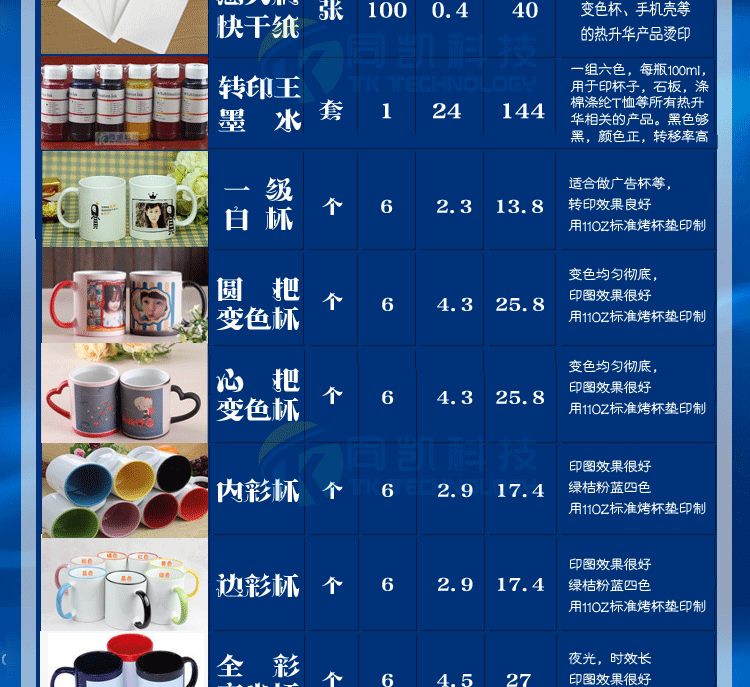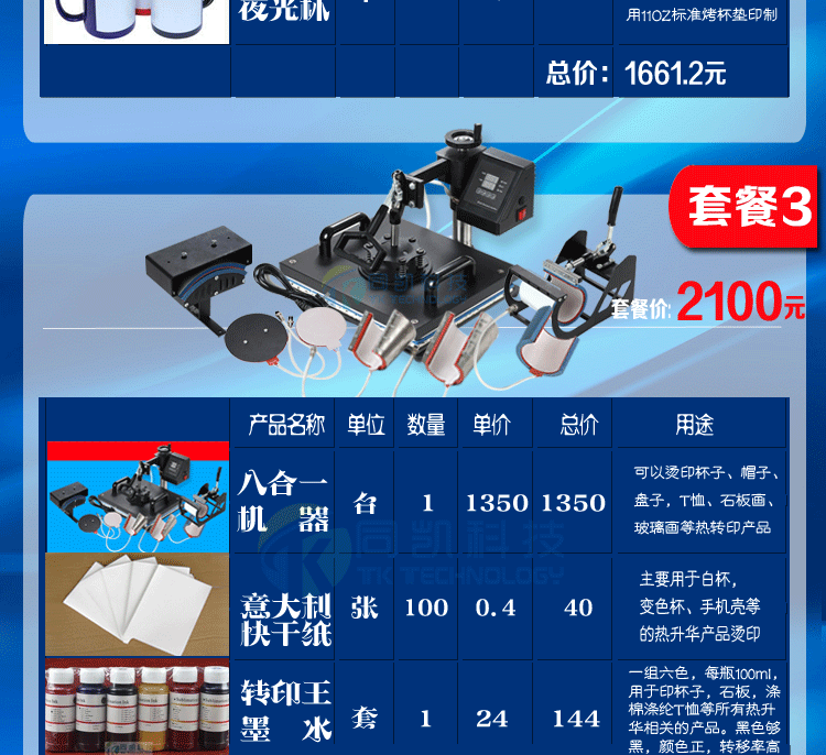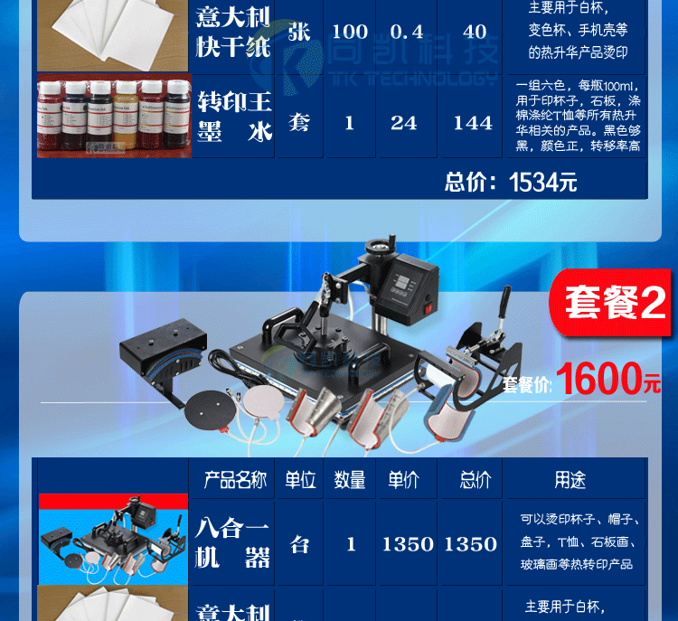 本产品为热转印多功能烫画机,能烤常规杯,小号杯,烫钻、烫画、烤帽,烤8寸盘,10寸盘、印T恤、抱枕、鼠标垫、拼图、瓷板、金属板等等,一机多用,适合新开店的用户使用。