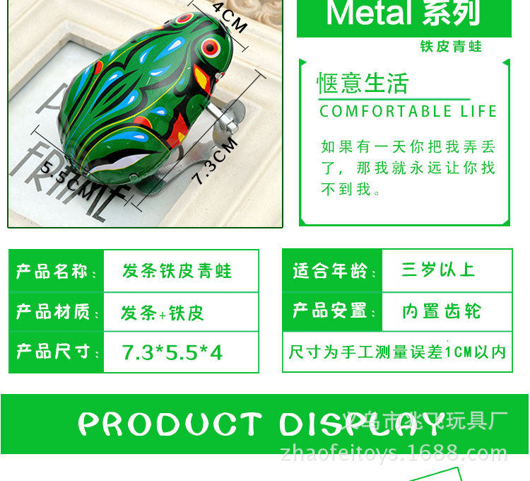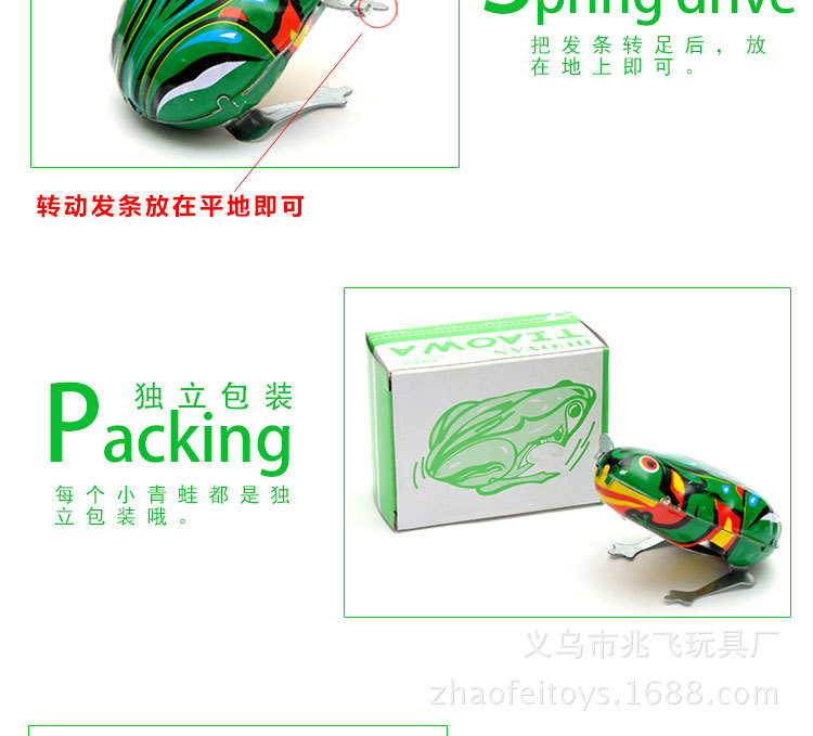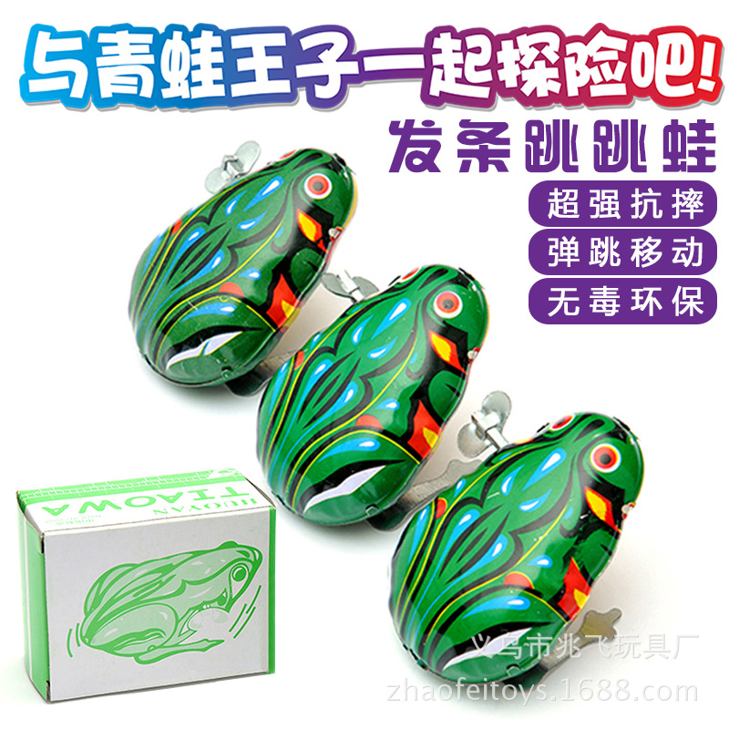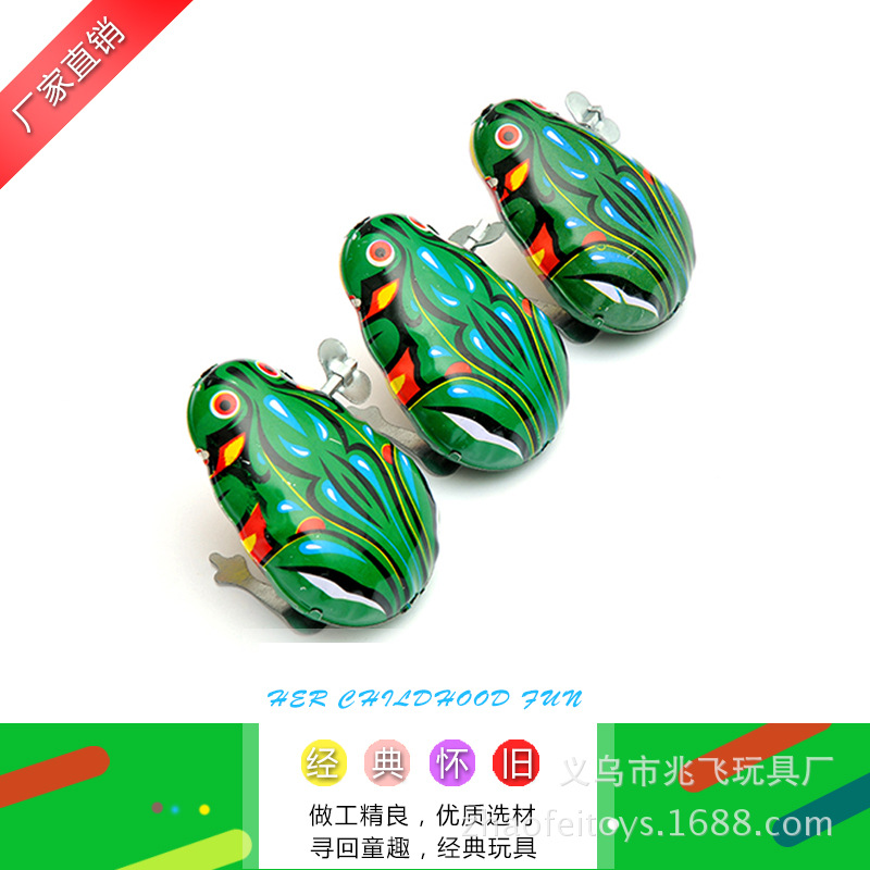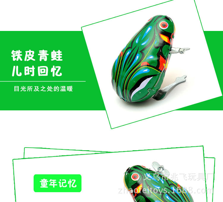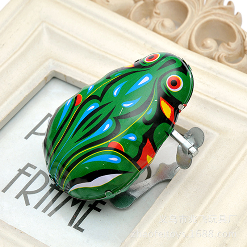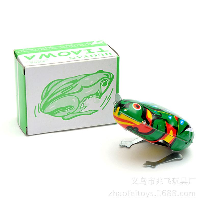 【产品介绍】材料铁皮,拧上发条会蹦蹦地跳跃,如果不跳时,按下青蛙的背部;本产品价格实惠,外表美观,精致可爱,是一款值得收藏怀旧的理想产品