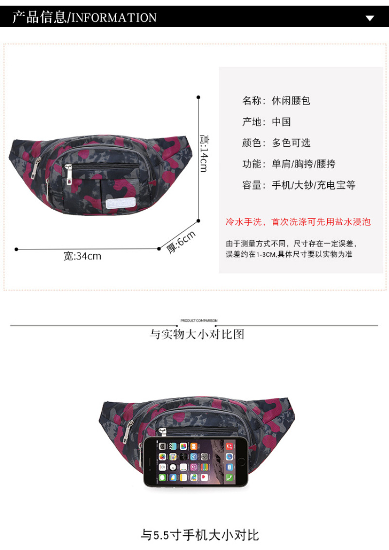 迷彩休闲腰包轻盈百搭个性收银包大容量腰挎包防盗手机包收钱腰包 投诉