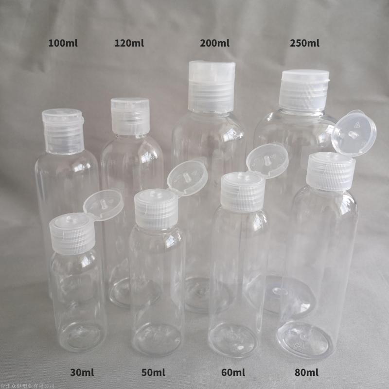 厂家供应透明圆柱型翻盖PET凝胶免洗手液塑料瓶消毒水包装瓶