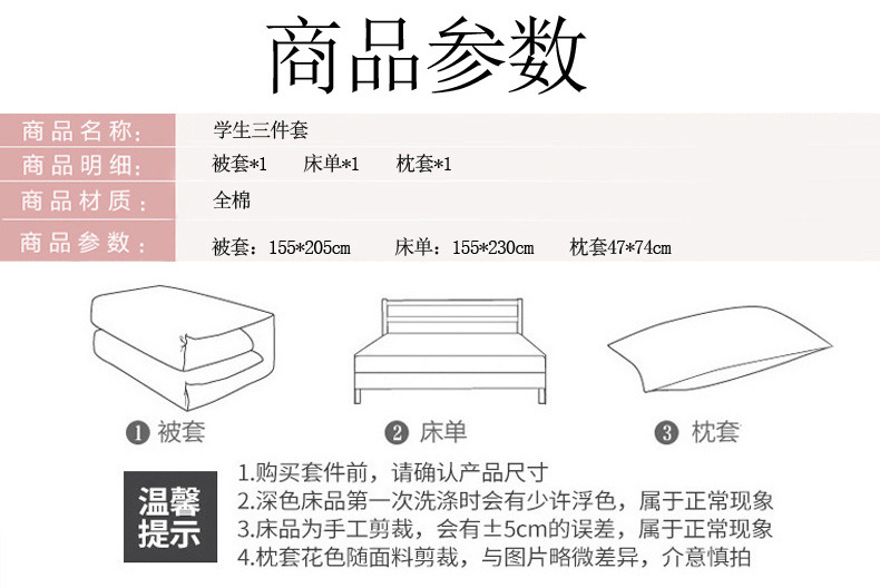 0.9米/1.0米床(被套155x205+床单150x230+枕套1只)三件套