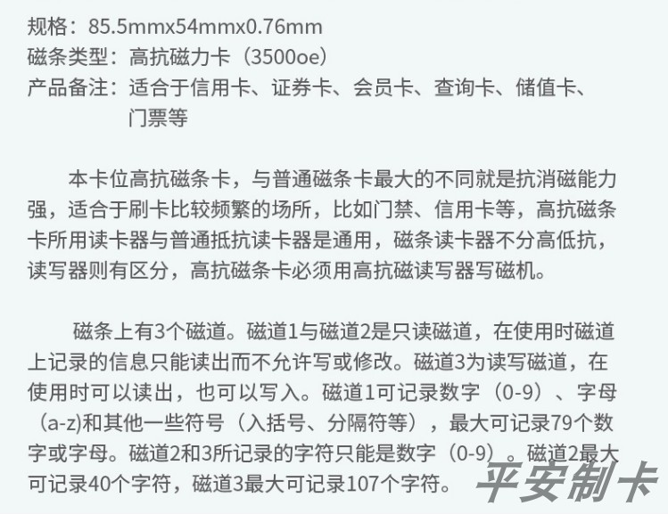 本卡为高抗磁条卡,与普通磁条卡最大的不同就是抗消磁能力强,适合于刷卡比较频繁的场所,比如门禁、信用卡等,高抗磁条卡所用读卡器与普通低抗读卡器是通用,磁条读卡器不分高低抗,读写器则有区分,高抗磁条卡必须用高抗磁读写器写磁,不能用低抗写磁机。
