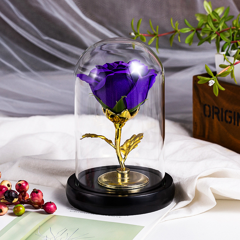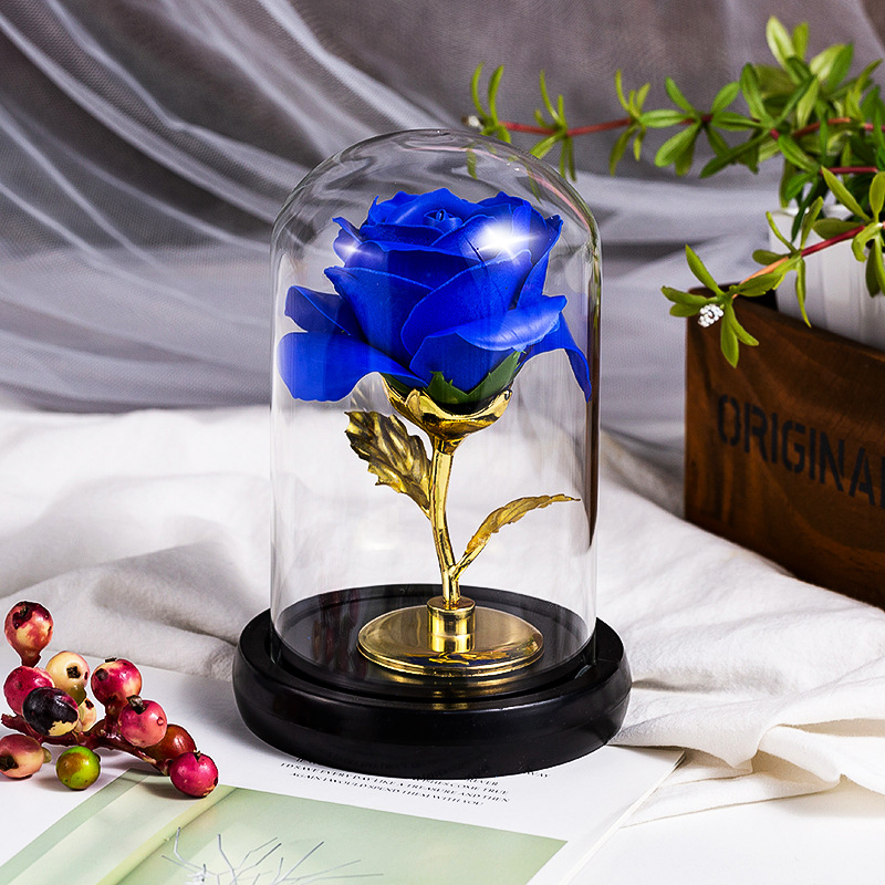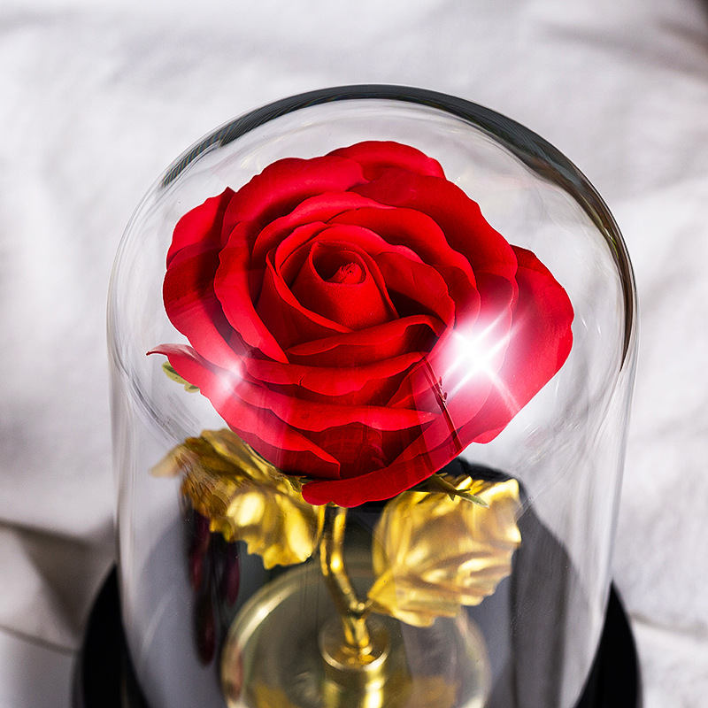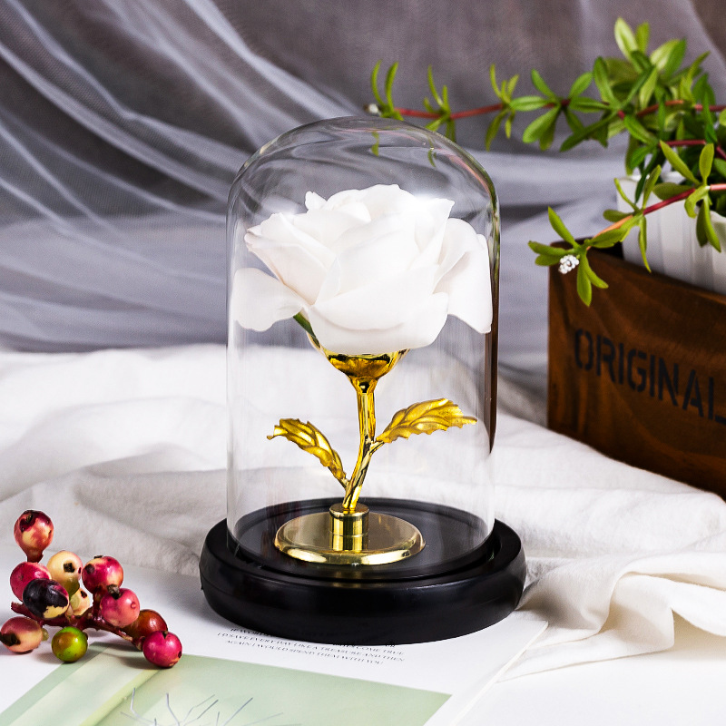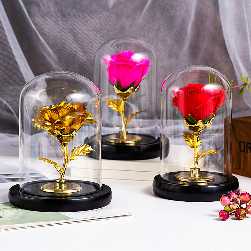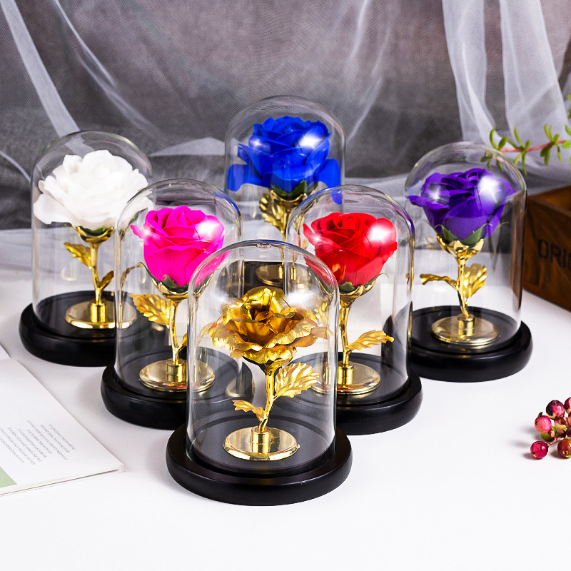 厂家仿真永生香皂玫瑰花玻璃罩金箔玫瑰花情人节创意礼品装饰摆件