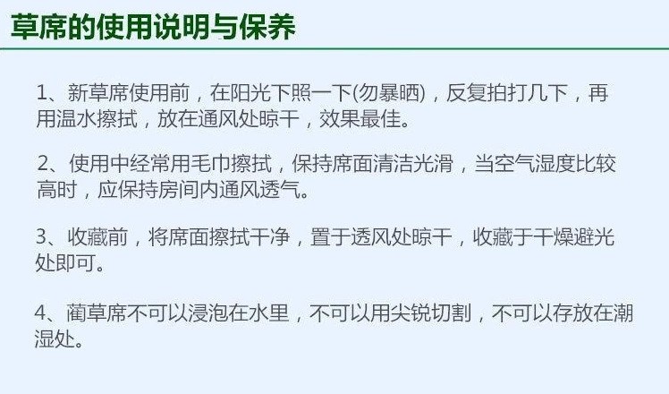 买家必看:我们专业生产草席多年,技术工艺 已经非常成熟,部分买家对草席表面有些许接头可能会有疑虑,其实这是很正常的,为了让草席内置的品质更好,每张草席我们都是人工亲手抹掉接头,应为我们生产的是原生态草席,更不会为了使草席更光滑,而使用化学药水使草席颜色更好看,使接头脱落而达到平整的效果。我们不会这么做,我们只做对人体有益、环保的草席,我们的目标是把大自然原汁原味的感觉带到您温馨的家。
