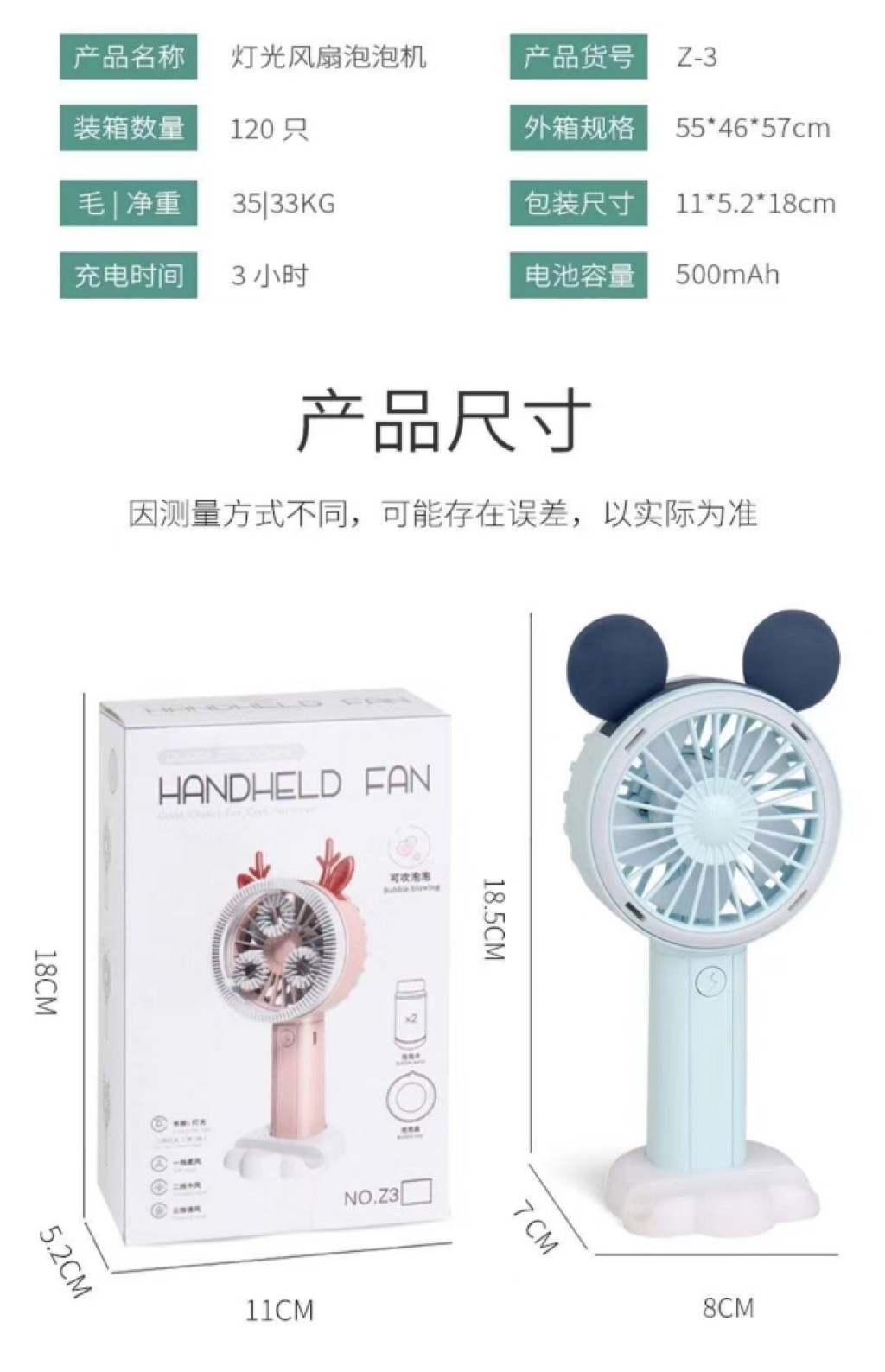 Z3 『产品名称』灯光风扇泡泡机(3色) 『产品规格』8*7*18.5cm 『产品包装』彩盒 『外箱装量』120pcs 『毛重净重』35/33kg 『外箱尺寸』55*46*57cm更新时间:2026-02-05 18:26