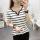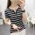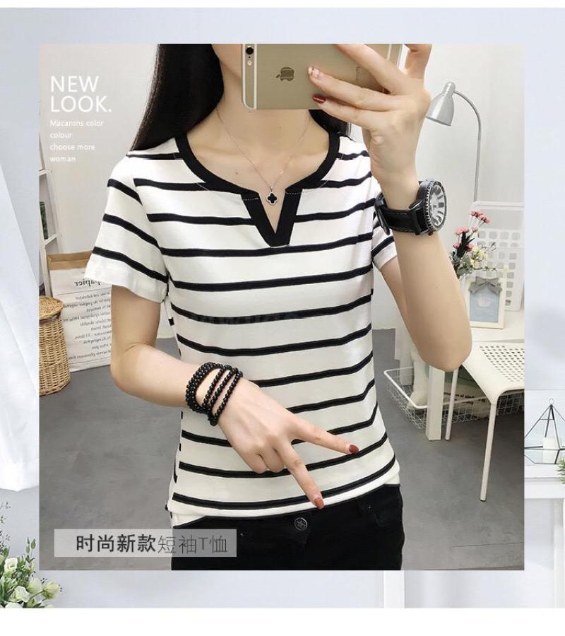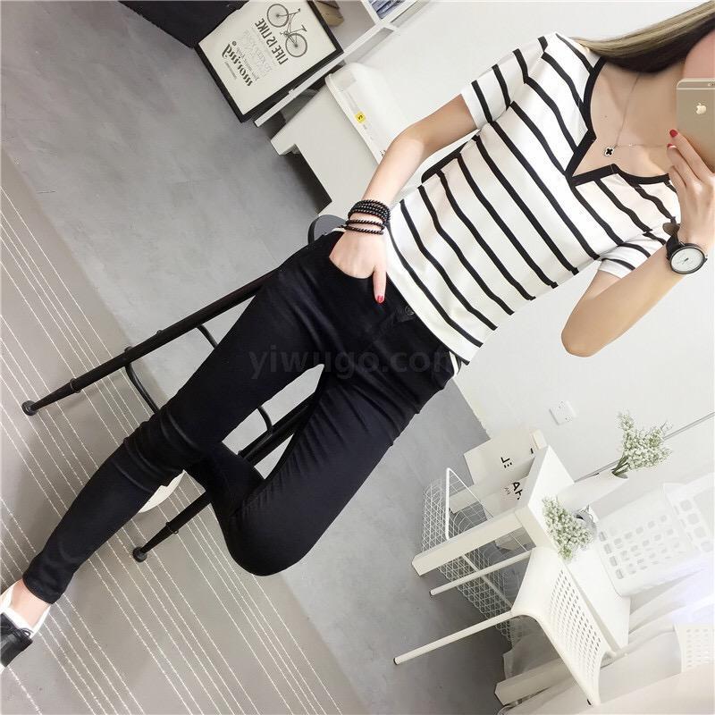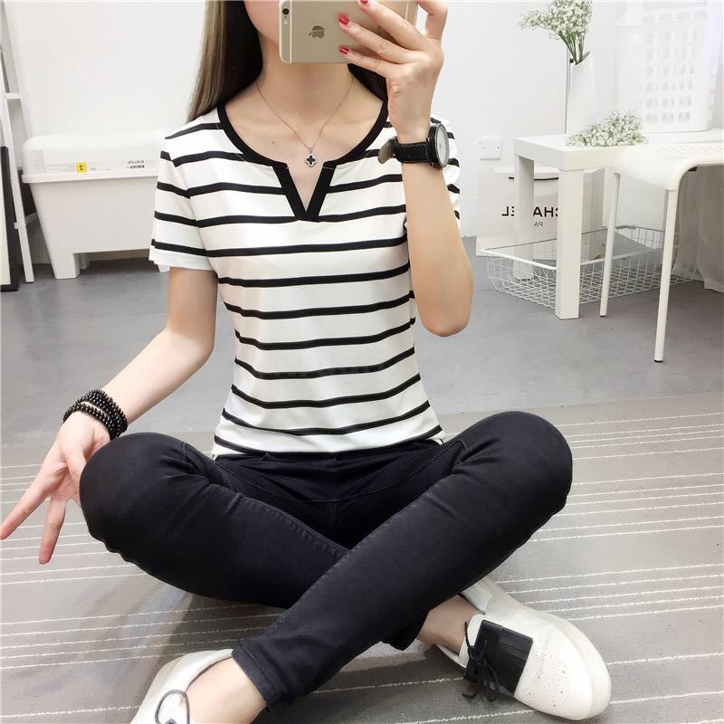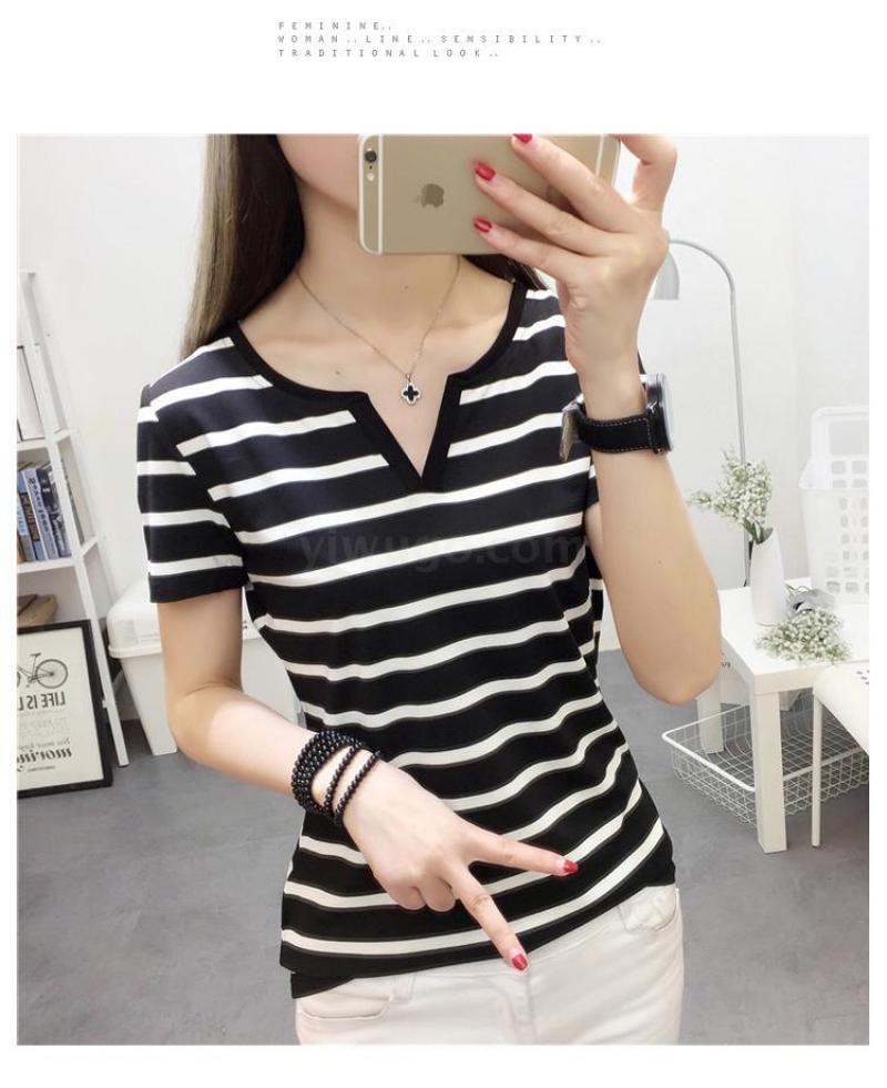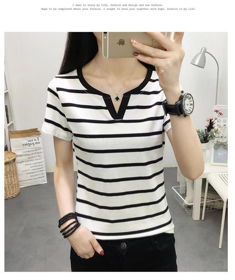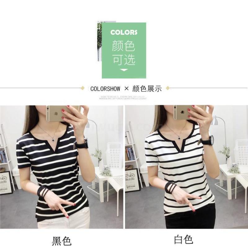 现货新款夏季大码女装修身短袖t恤外穿百搭黑白条纹上衣打底衫Y领 投诉
