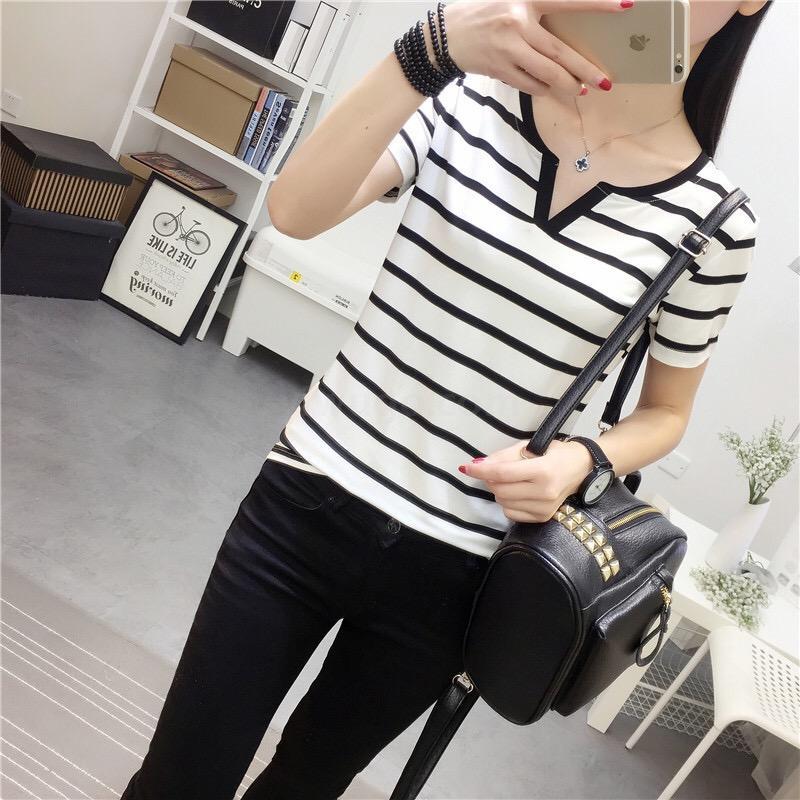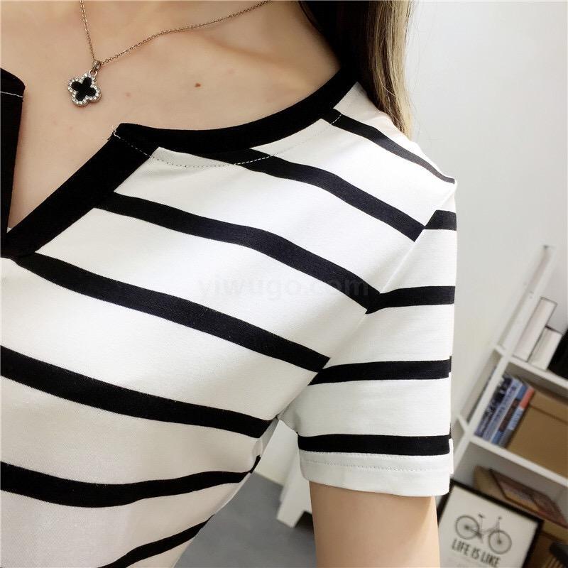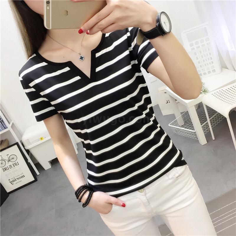 现货新款夏季大码女装修身短袖t恤外穿百搭黑白条纹上衣打底衫Y领
