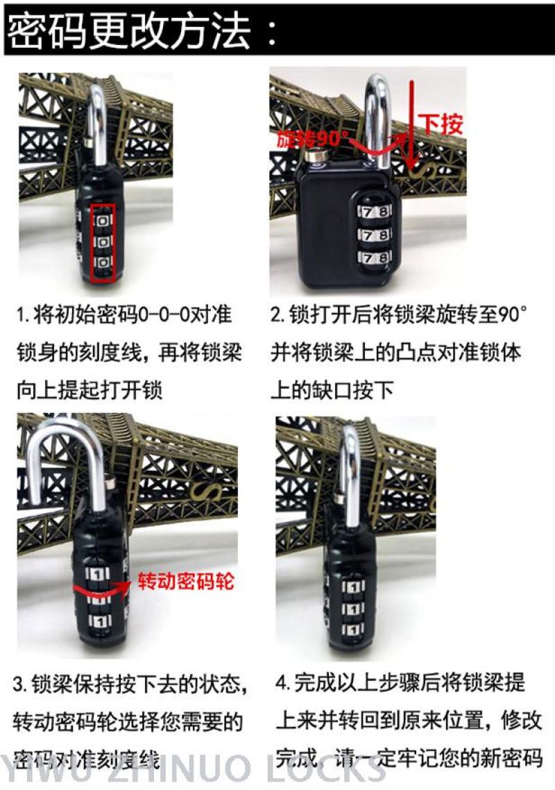 关于它 :这款是按外贸客人要求设计开模的新款密码锁,质量好,外形和尺寸都很讨喜、实用。锁体四角做了圆边处理,有种肥嘟嘟的圆润感,整个锁头小巧实用,可以锁旅行背包、学生书包、拉杆箱、衣柜、健身房储物柜、工具箱、抽屉柜子等