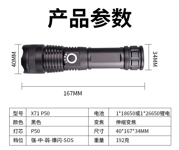 多功能led铝合金手电筒P50灯泡超亮伸缩变焦USB充电户外 投诉