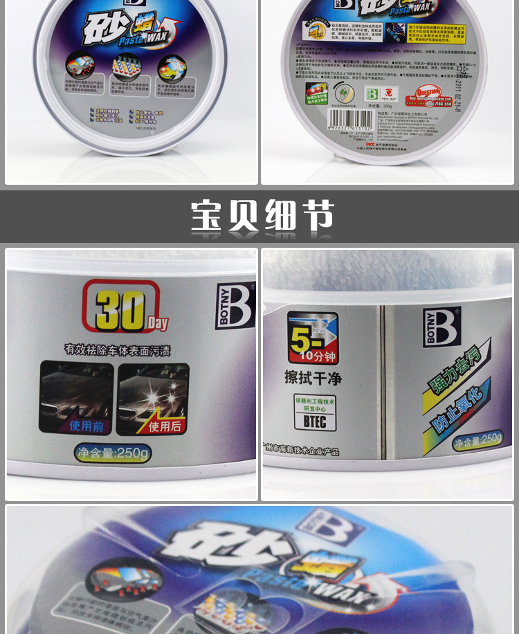 经反复测试,保赐利坚持选用优质研磨材料制作砂蜡,颗粒细腻,酸碱适中,明显去污、去划痕效果。真心诚意,物有所值。