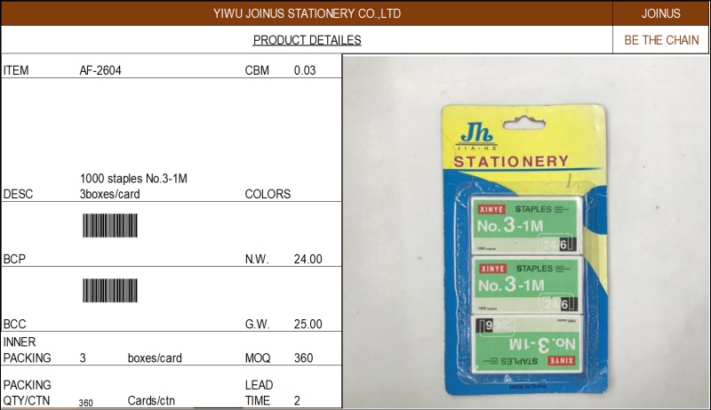 3号型订书针办公室订书机通用订书钉3号针标准型钉3包1卡AF-2604 投诉