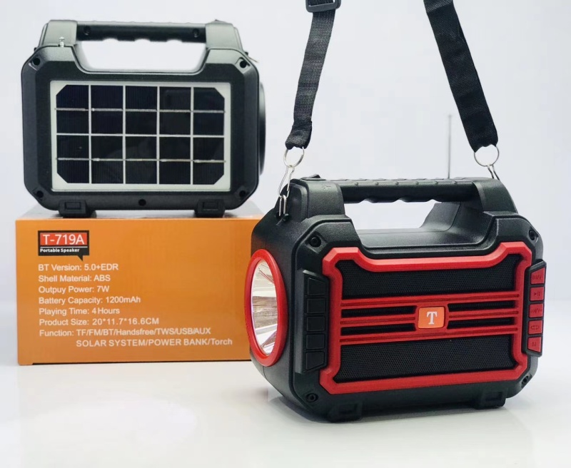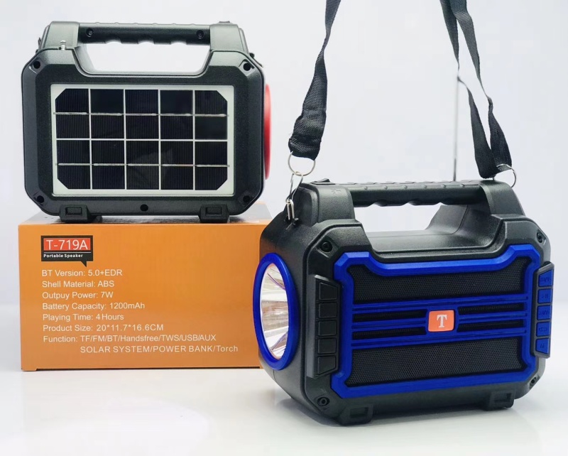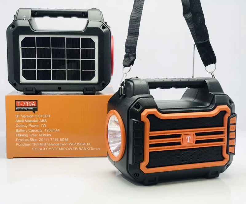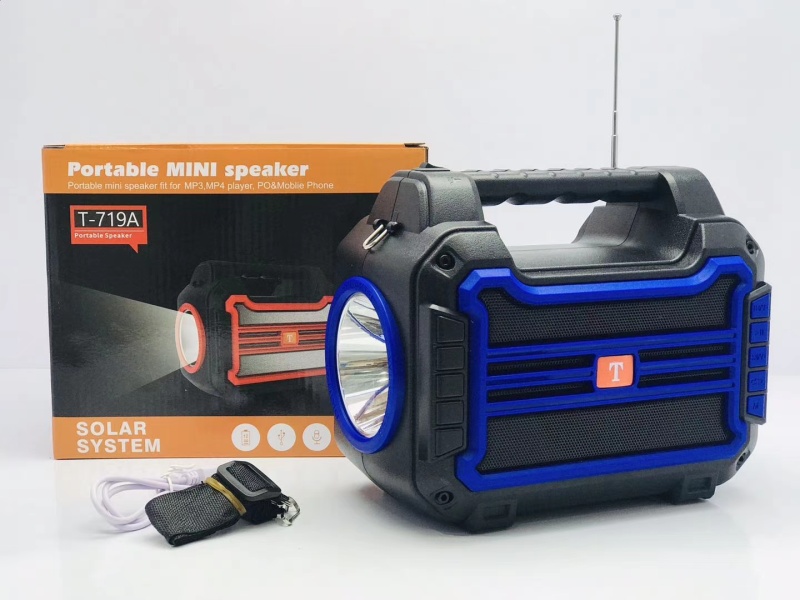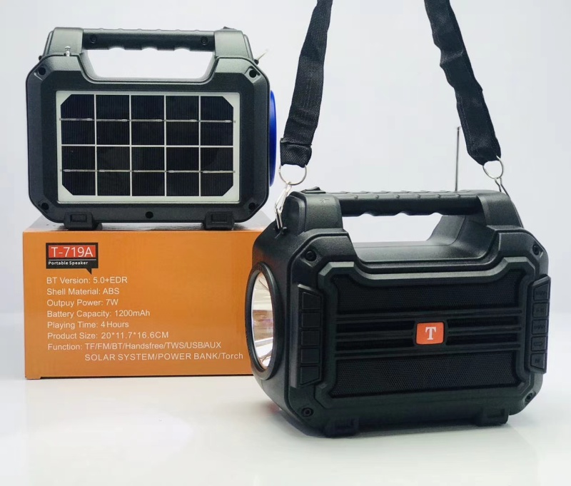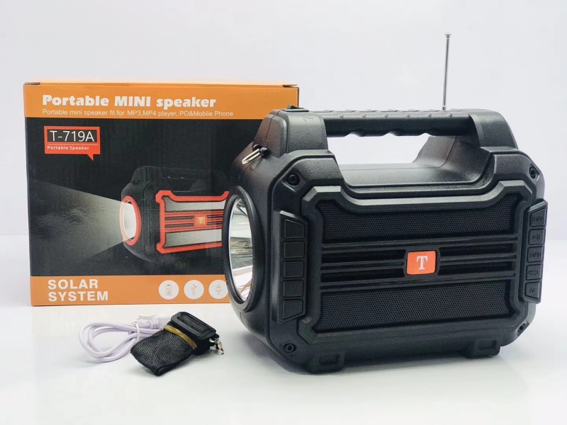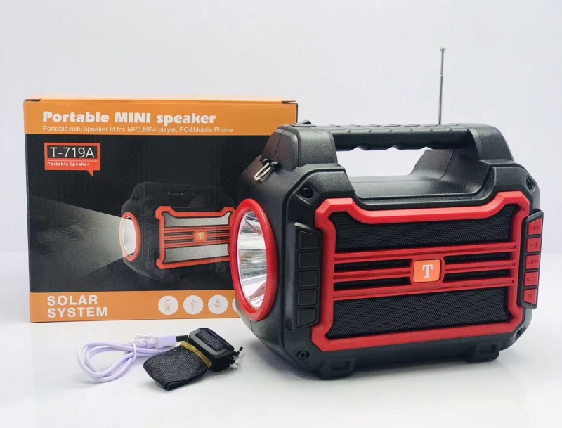 新款太阳能音箱带手电筒 产品型号:T-719A 产品尺寸:200*115*168 mm 外箱尺寸:62.5*42.5*53.5 cm 装箱数: 30 PCS 毛重:30.2 KG 颜色:黑/红/蓝/橙