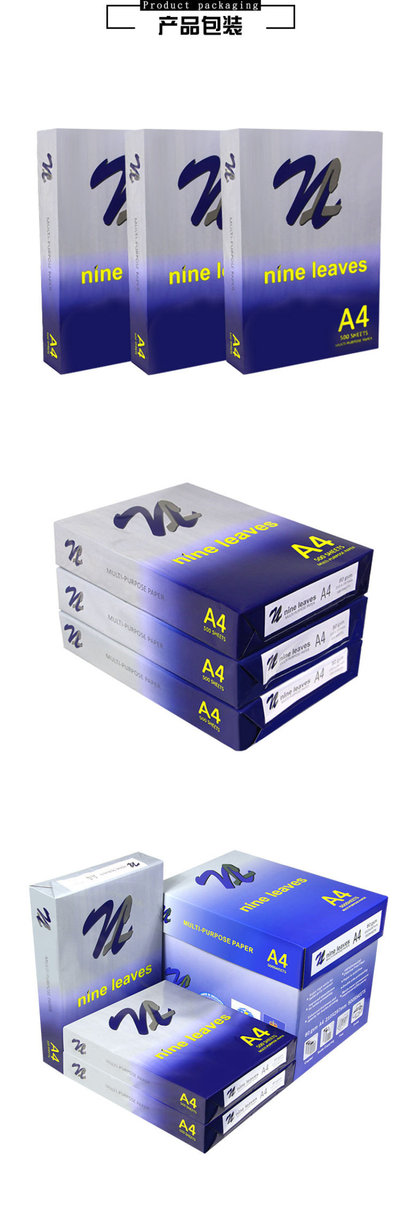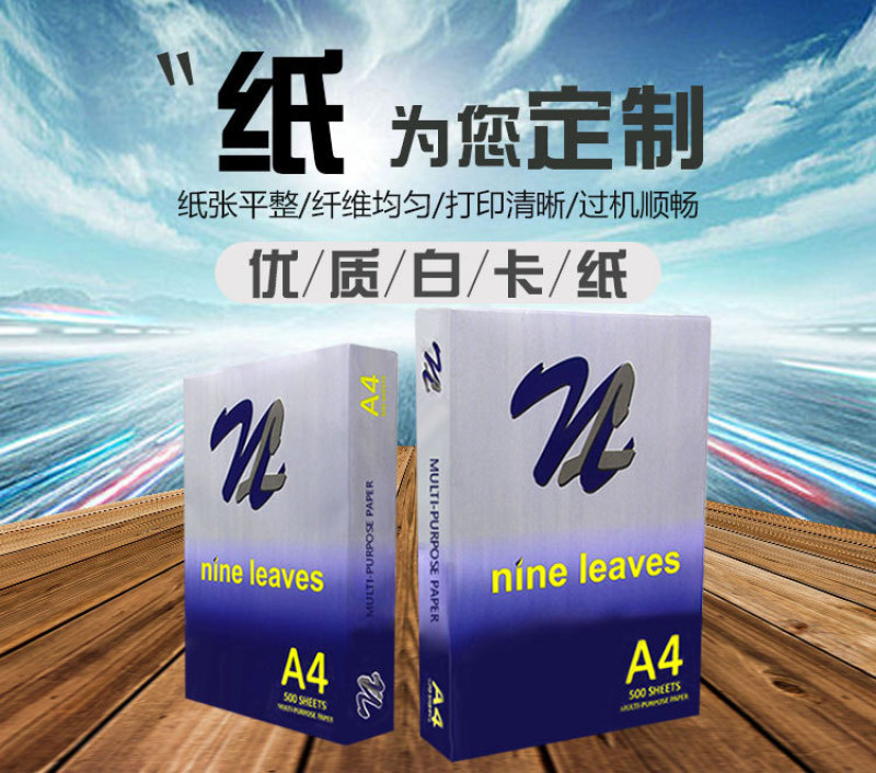 新包装:标准70克 100%原生浆,每包500张,不起纸粉,不变脆, 紧密度及加工层次高,防潮性佳,平滑度高,复印越清晰,加专业防潮包装。 高温高压复印不产生有害酸性气体,填料柔软,不磨损复印机零件,不具腐蚀性