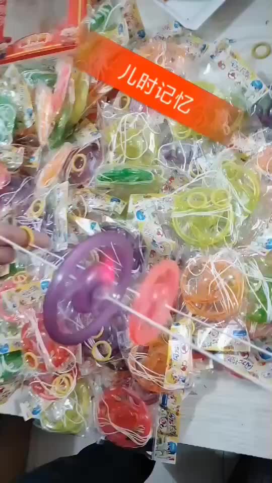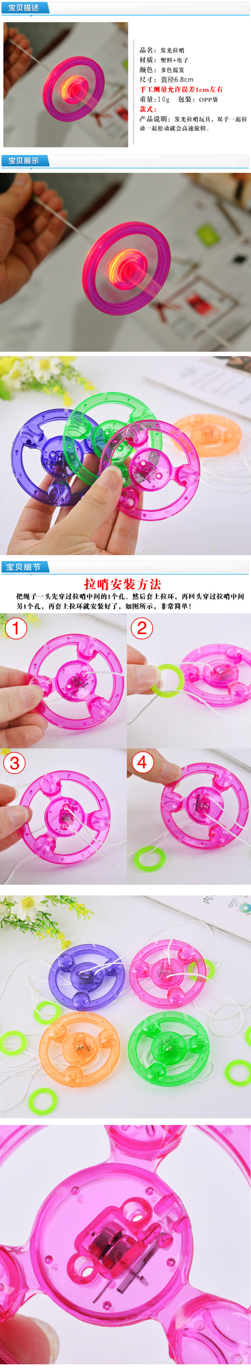 拉绳玩具,通过拉动,飞轮高速旋转,发出七彩光环,并伴有响亮的哨声,夜间效果更好!!!