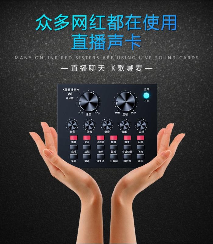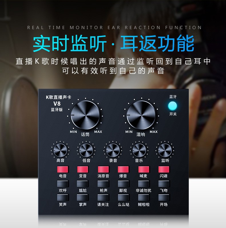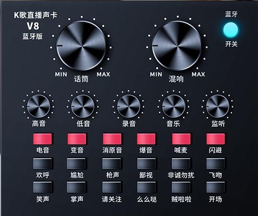 1.12种电音,12种音效,6种效果模式,混响大小调节,话筒音量调节,高低音调节,录音音量调节,音乐音量调节,监听音量调节(即耳返功能)。