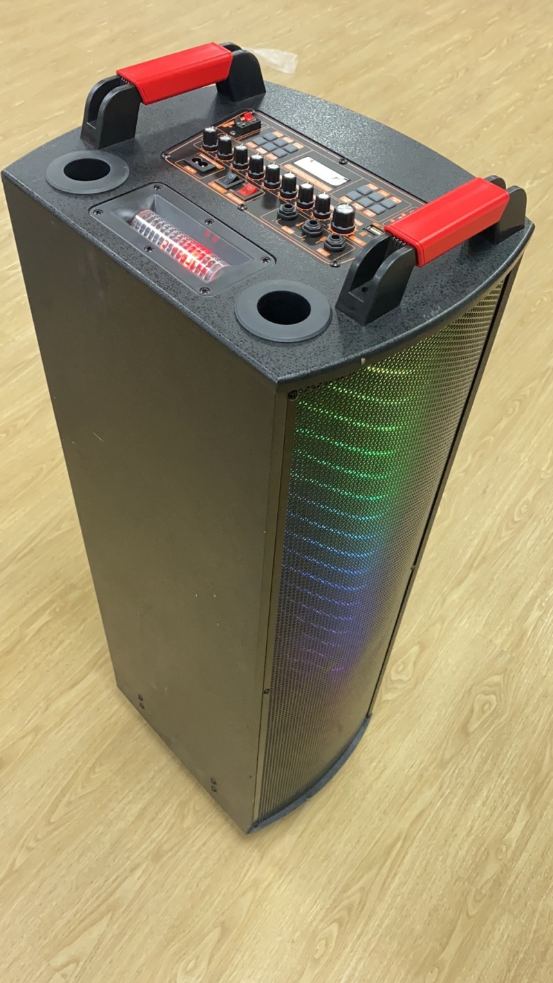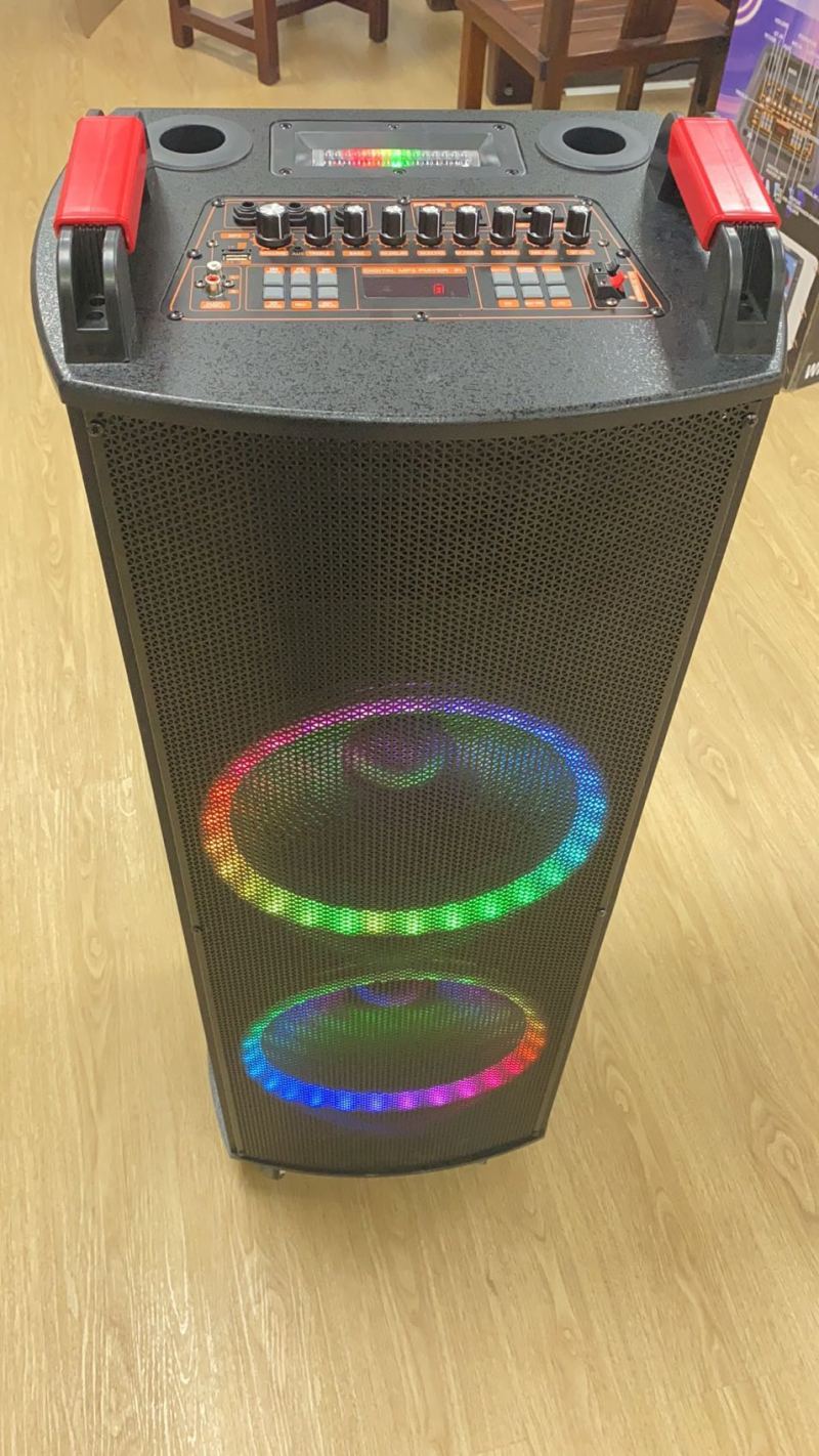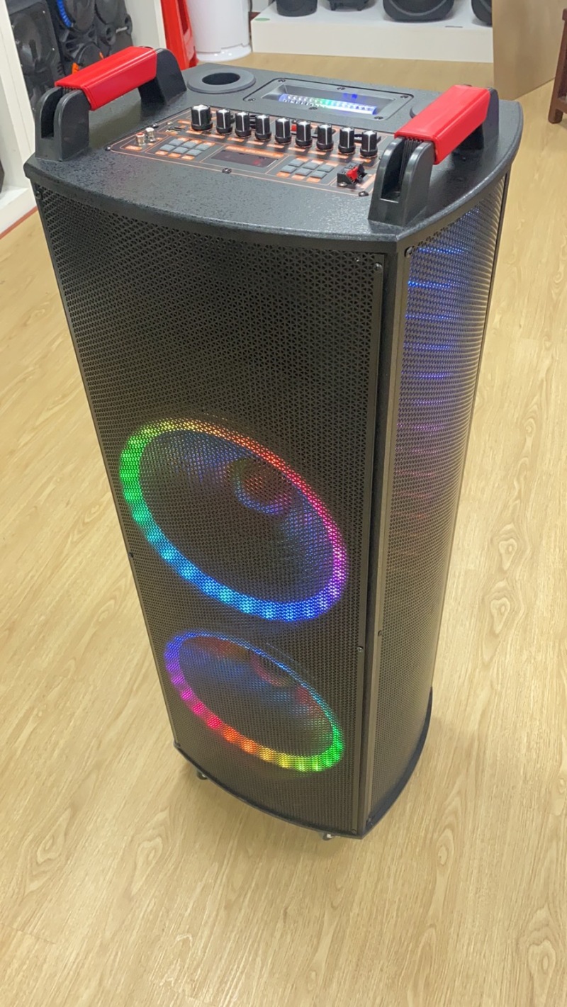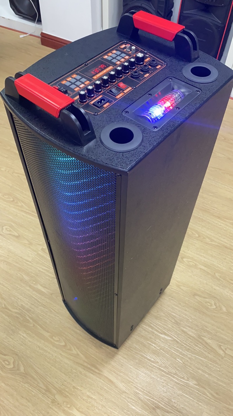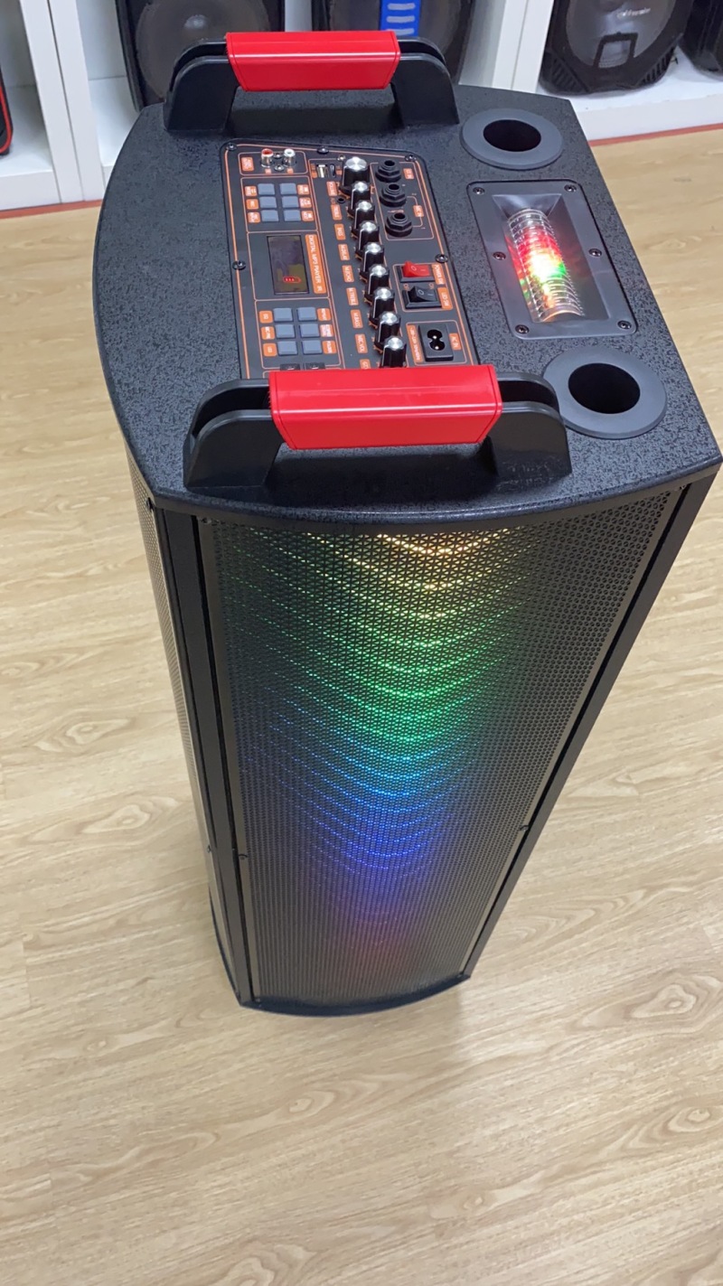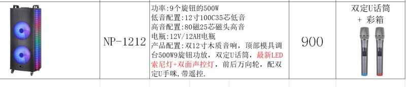 产品配置:双12寸木质音响,顶部模具调台500W9旋钮功放,双定U话筒,最新LED索尼灯+双面声控灯,前后万向轮,配双定U手咪,带遥控.