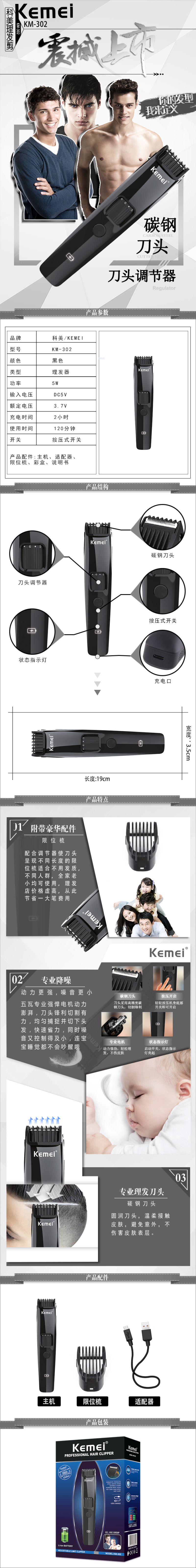 跨境厂家直供科美理发器 KM-302 USB充电 干电池理发剪 投诉
