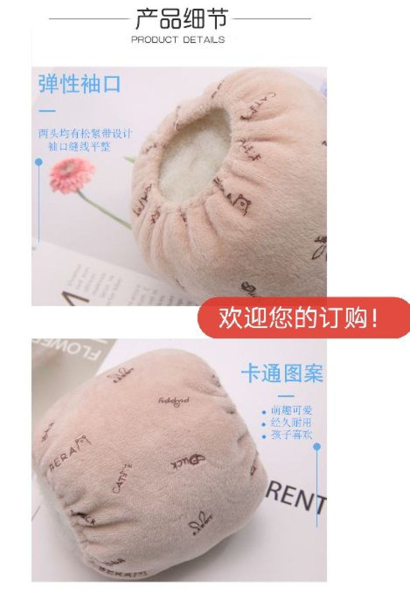 宝宝时尚简约保暖印花图案可爱套袖 儿童冬季防污绒布卡通袖套,既要防污,更要漂亮。耐磨耐穿,光滑无毛刺。弹性袖口和卡通图案的设计更适合小朋友。