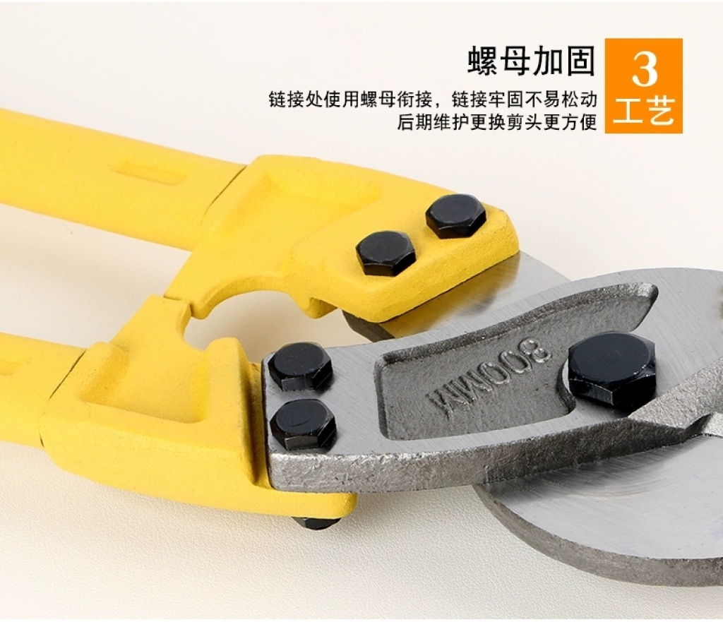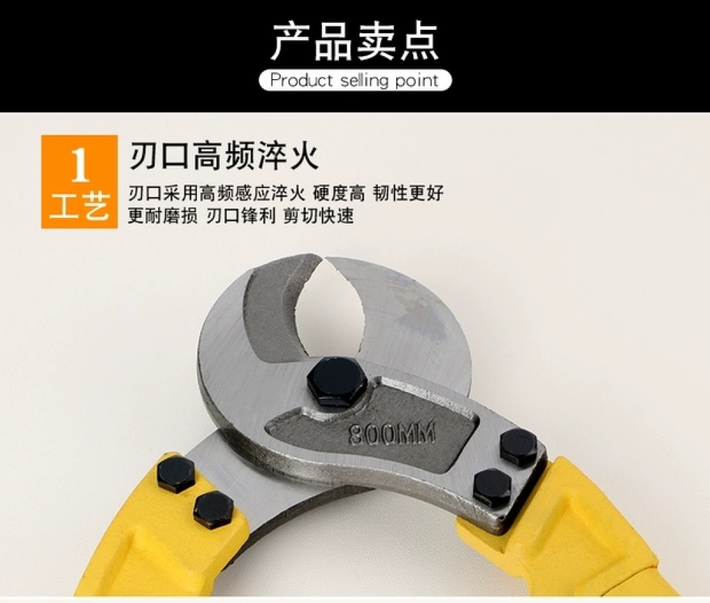 刃口高频淬火,剪切锋利,切口整齐,坚固耐磨损。产品只适合剪切铜芯电缆铝芯电缆。不能剪切钢丝铁丝钢丝绳铠甲电缆等硬质的产品。不同规格不同价格,请来电询价