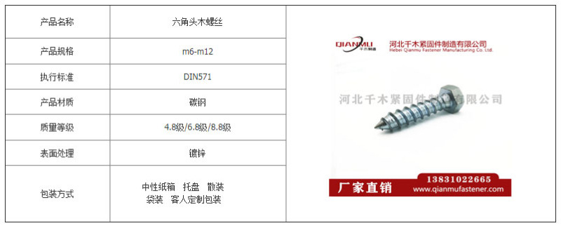 品牌: 千木 型号: M6 头型: 六角头 类别: 木螺钉 螺钉直径: 6mm 槽型: 外六角 产品规格: 6*40,6*50,6*60,6*70,6*80,6*90,6*100,6*110,6*120,6*150,8*40,8*50,8*60,8*70,8*80,8*90,8*100,8*120,8*1