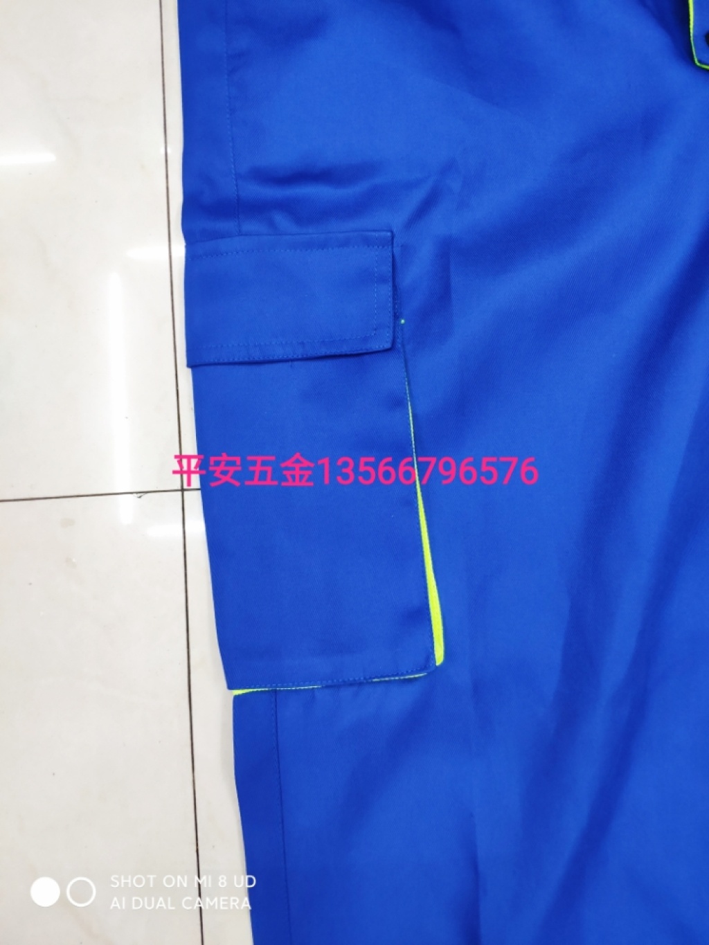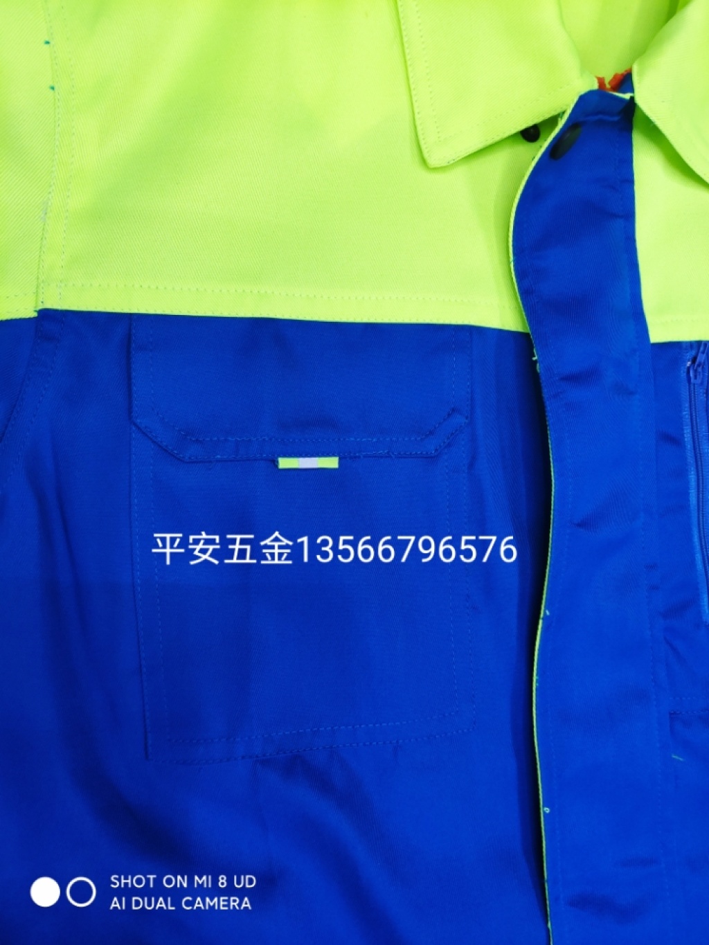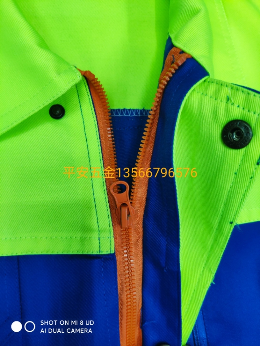 颜色靓丽够宽松够肥树脂拉链,拖穿方便大口袋,有反光标志袖口纽扣,按压方便手臂上有口袋,放笔更方便裤腿上有口袋,可以放手机