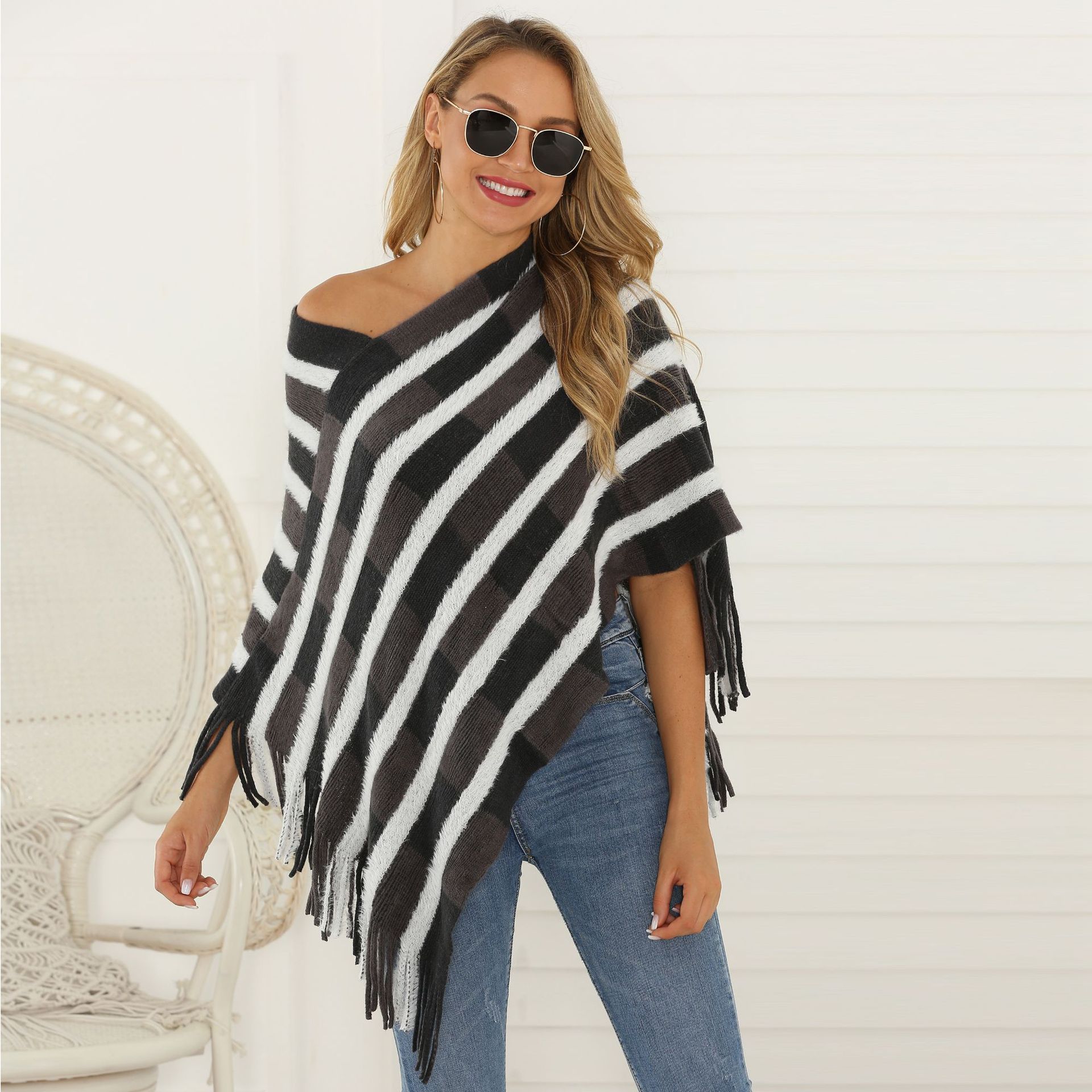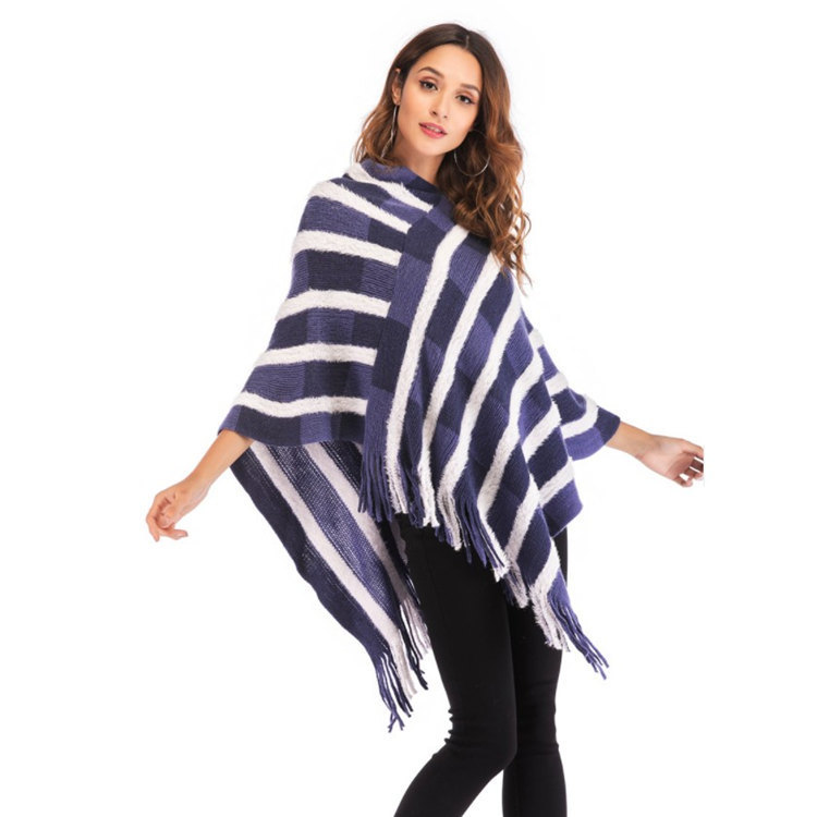 百搭时尚爆款欧美2020秋季女装条纹流苏毛衣披肩围巾斗篷衫外套 English | 投诉