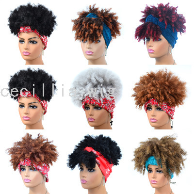 外贸头巾假发货源 黑色渐变小卷爆炸头头套发带头巾假发头套
