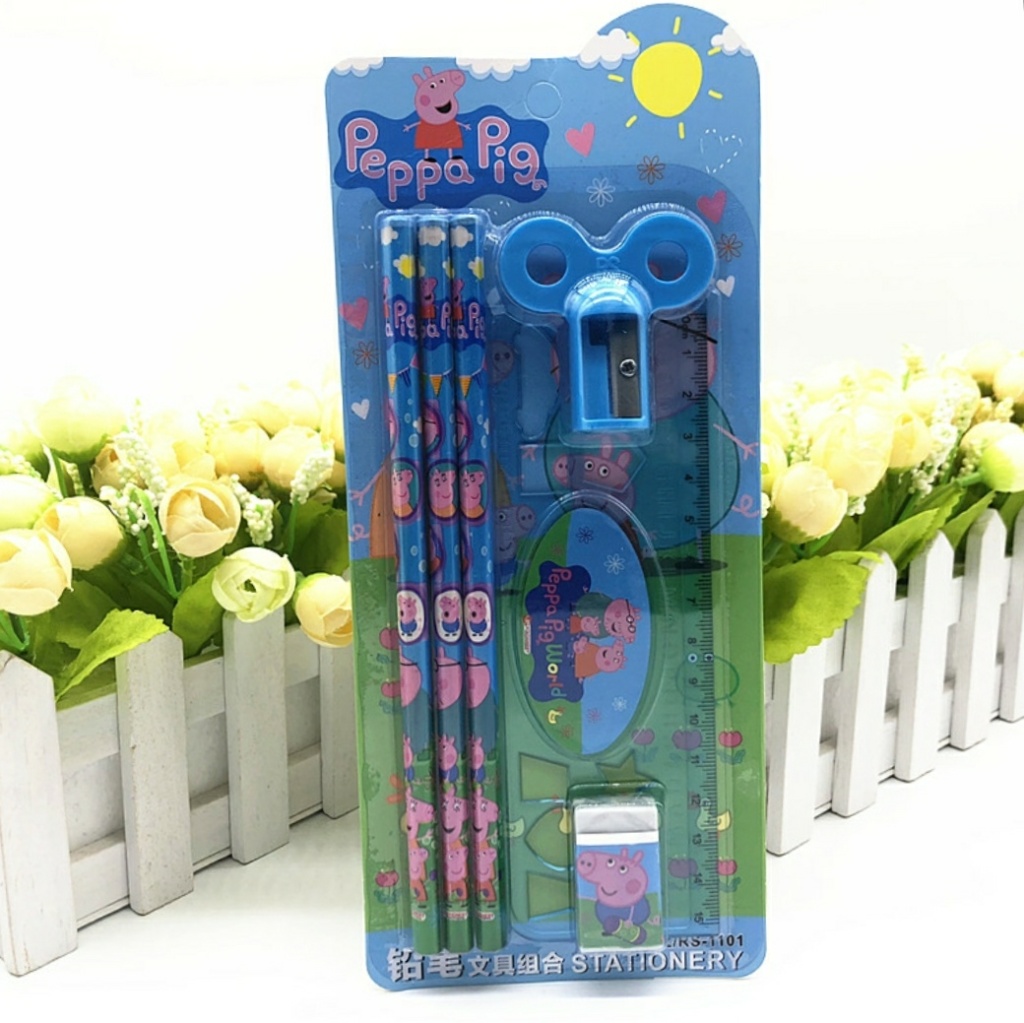 儿童幼儿园小学生书写文具铅笔套装 里面包含三支铅笔,一把尺子,一个卷笔刀,一块橡皮擦。适合三岁以上孩童。