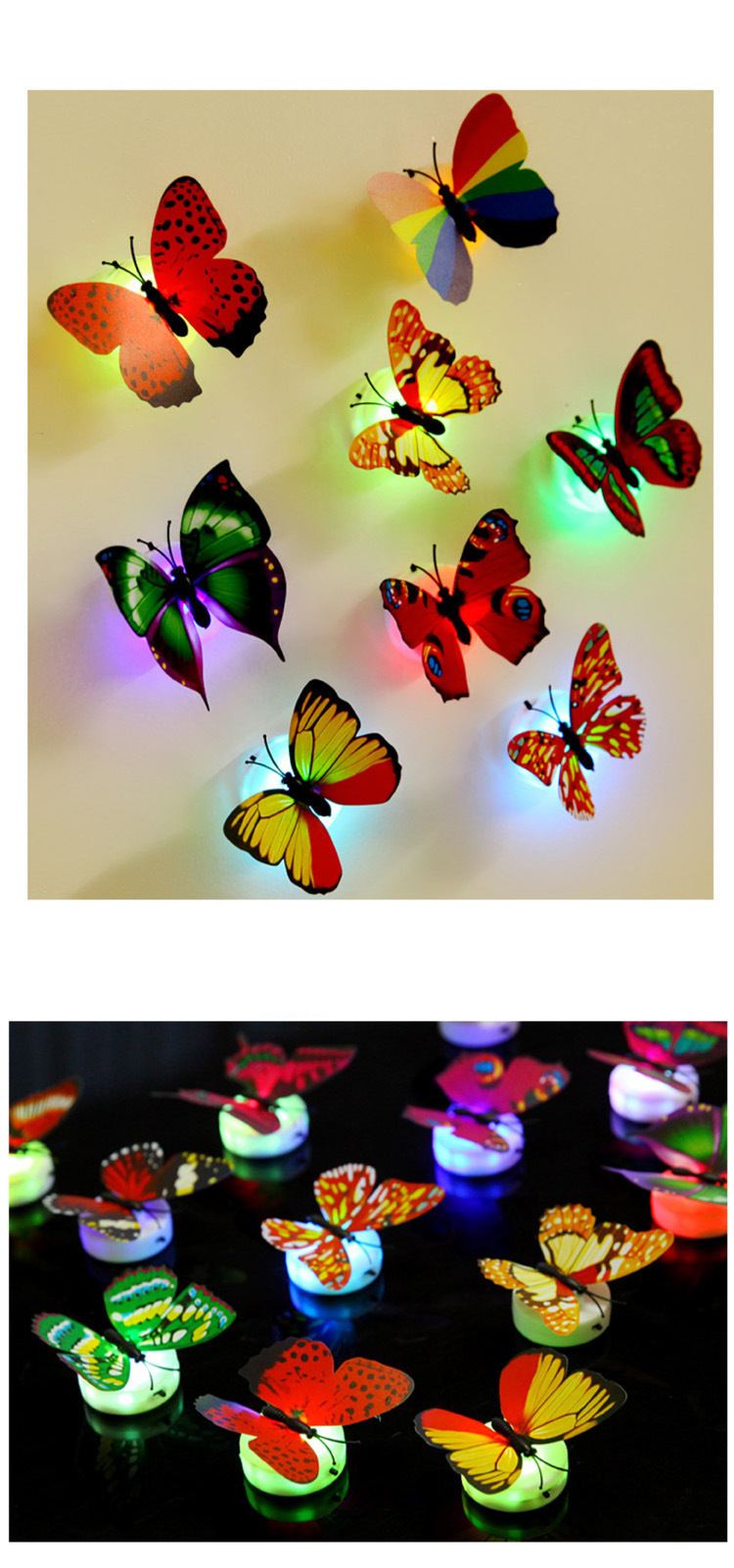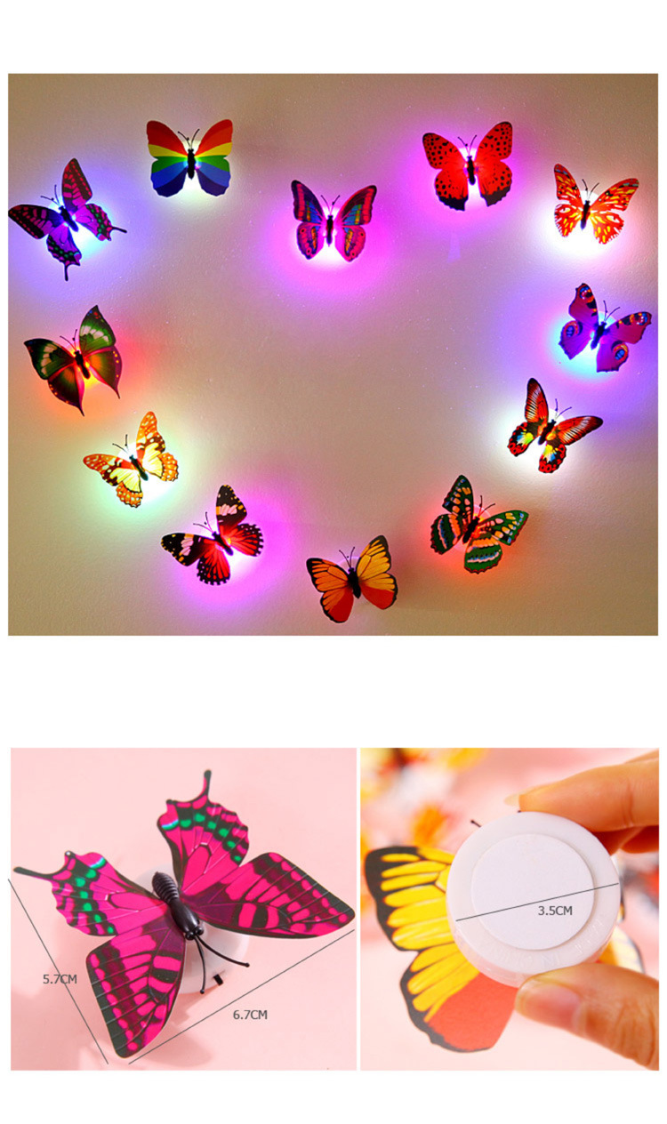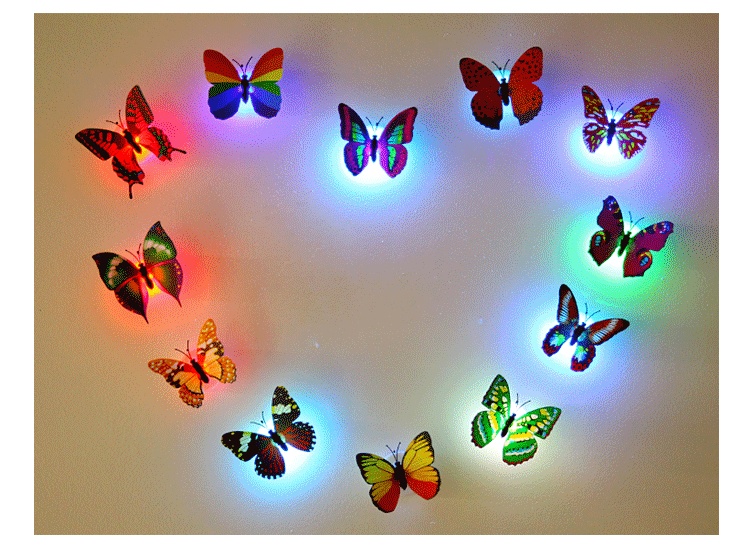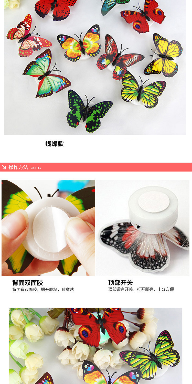 2:有多种颜色,仿真蝴蝶可以装饰我们生活的每个角落:底部有双面胶,原配3个AG13电子,打开开关就可发光,很绚丽,吸引眼球。