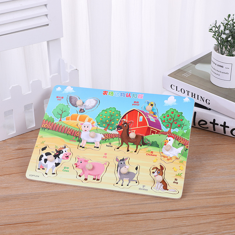 儿童智力拼图 木制宝宝早教农场动物益智拼版玩具认知平面手抓板