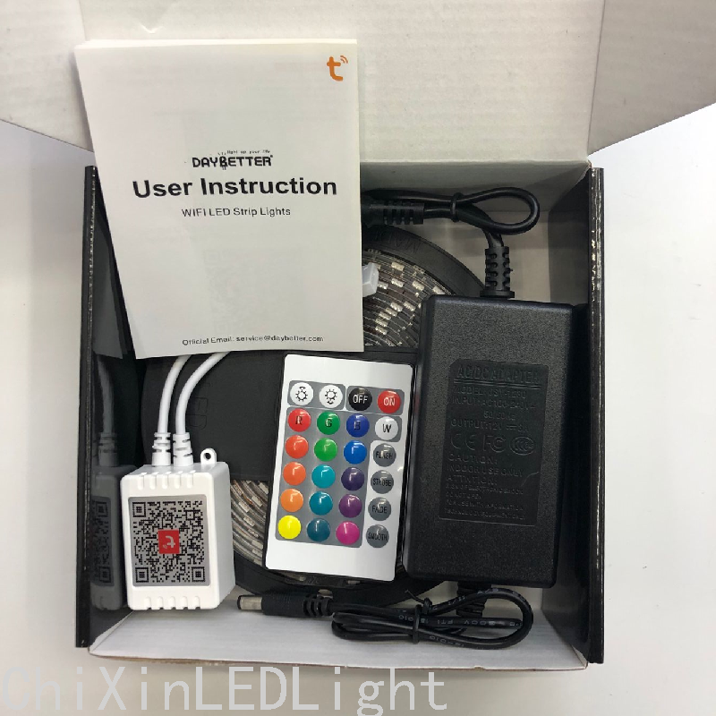 商品名称:LED灯带套装 INPUT:AC100-240V~50/60HZ OUTPUT:12V3A 长度:5米 灯珠型号:5050 包装:彩盒套装 功能:蓝牙,WIFI,遥控