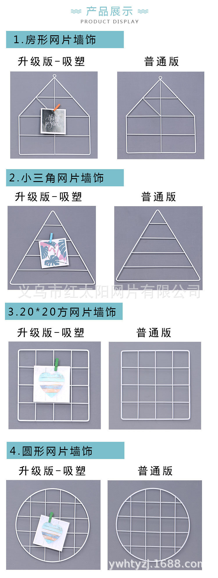义乌红太阳网片公司主要产品有网片,超市夜市网片,重型货架、中型货架、轻型货架 ,超市货架,珠宝展示架,空洞展示架,各式挂篮,挂钩,衣架等。 材质主要为:精致钢。 义乌红太阳是国内较早生产、销售 货架的商家之一,产品专业生产加工的公司,拥有完整、科学的质量管理体系等商业设施的设计和制作。本公司实力雄厚、声誉卓著,拥有先进的生产设备,尖端的生产技术和完善的售后服务;可满足客户不同的设计需求和使用需要。本厂产品均经静电喷塑,耐腐蚀,结构合理,任意组装,承重力强,可多次拆装,广泛应用社会各行业。 我们相信客户的眼光!真诚的期待各界朋友和新老客户的光临指导! 信条 :公司恪守:“客户至上、热情服务,急客户所急”,竭诚为您提供便捷高效的服务。 我们保证您能得到全方位的服务!红太阳网片有限公司的诚信、实力和产品质量获得业界的认可。欢迎各界朋友莅临参观、指导和业务洽谈,公司本着:以质量求生存,以效率求空间,以信誉求发展,奉客户为上帝,我们用努力和汗水,去赢得市场,赢得掌声,恁的鼓励是对我们的支持!