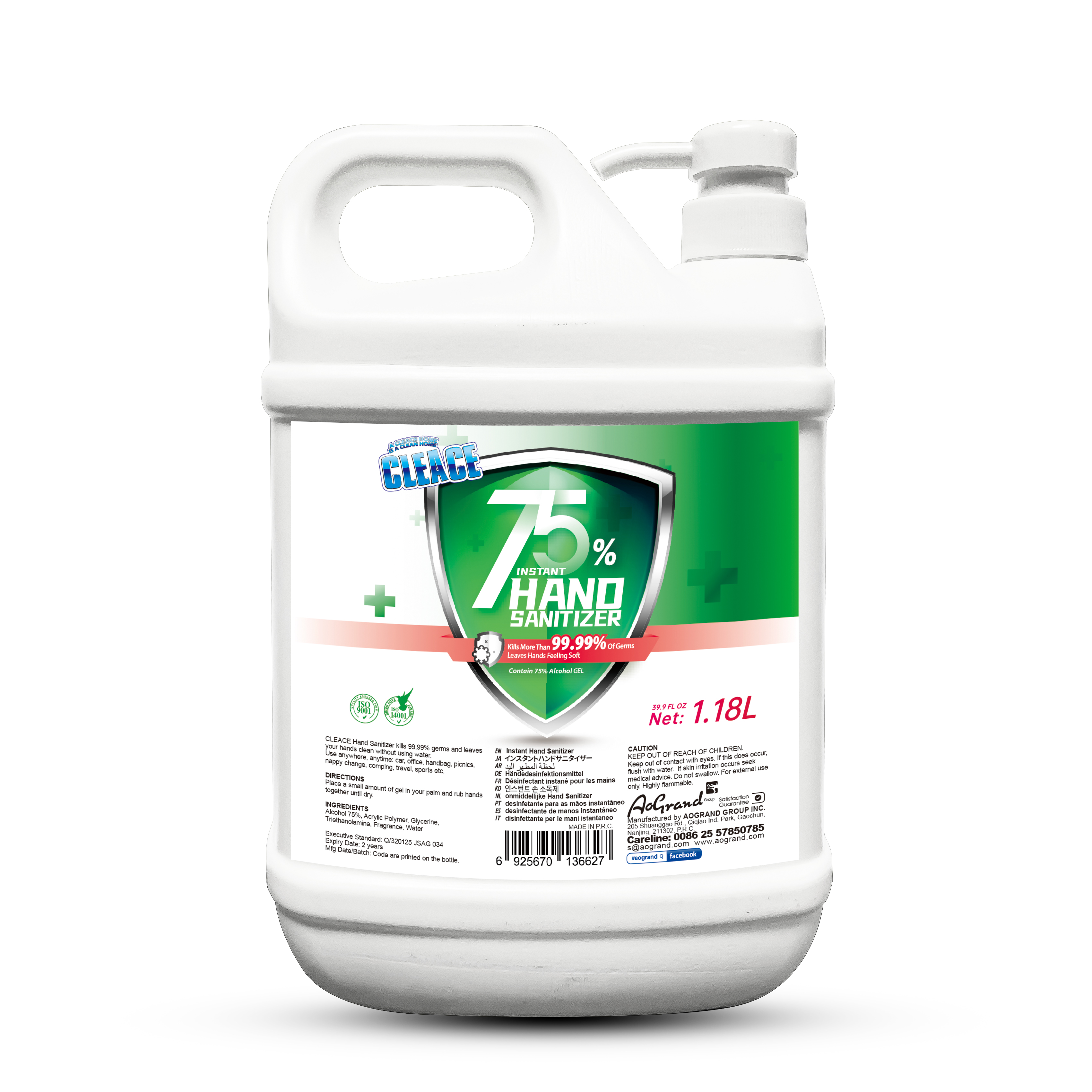 Cleace 1.18L酒精消毒洗手液大瓶装,全国直邮,厂家直销专供出口 English | 投诉
