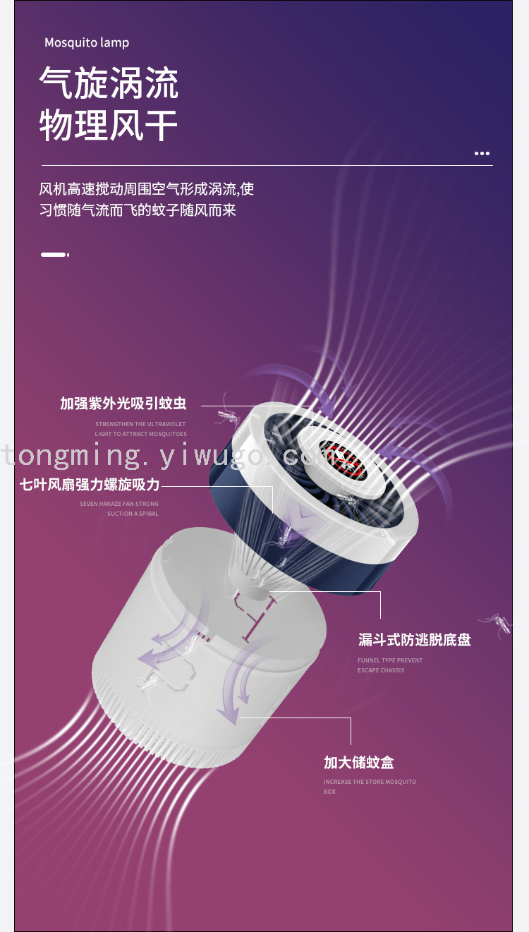 2. 360 DEGREES SUCTION FAN --- Mosquitoes flying at close proximity from any direction will be sucked into the insect trapper with