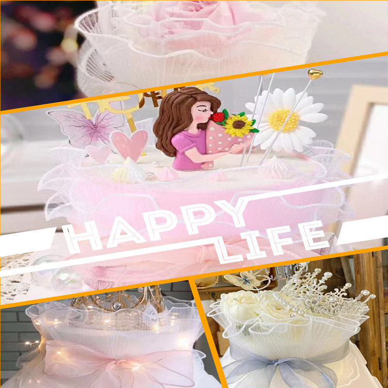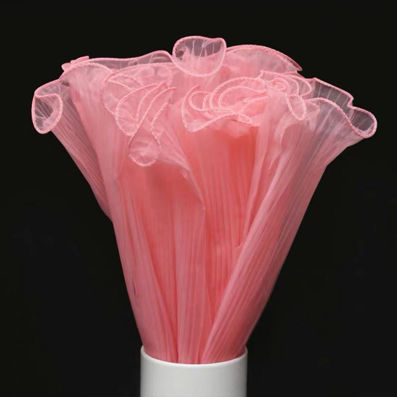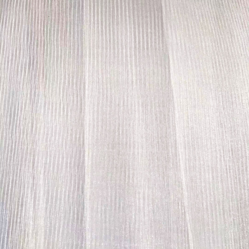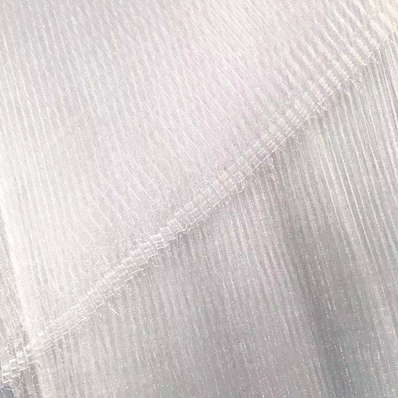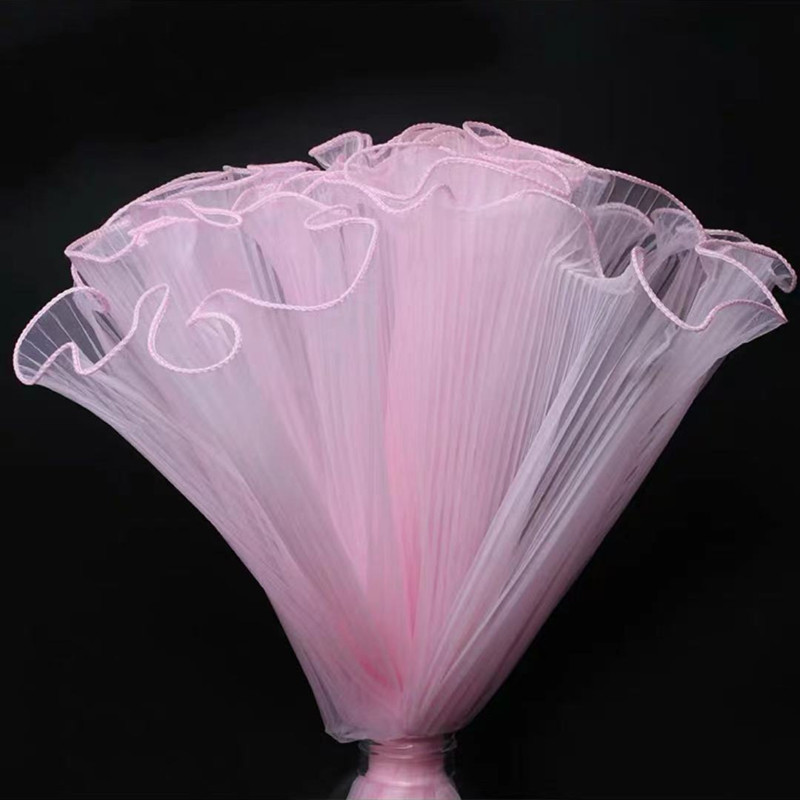 该款布料底布为欧根纱,经过压褶(压折)处理,形成纹理清晰,手感硬挺的布料,可用于新款鲜花包装,蛋糕装饰,婚礼现场装饰等等。