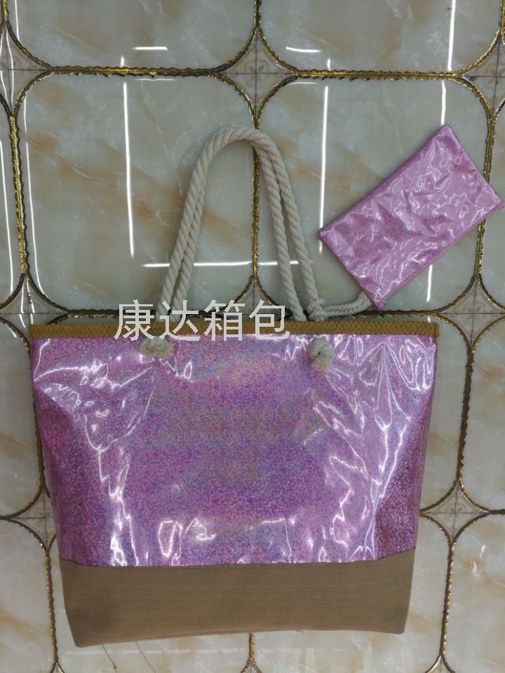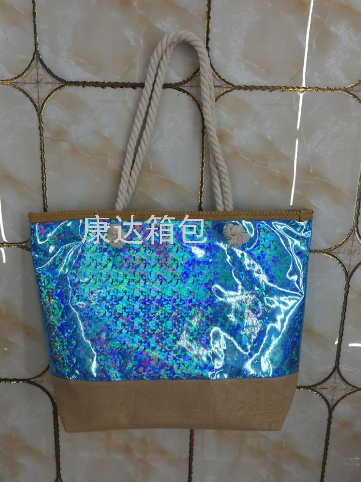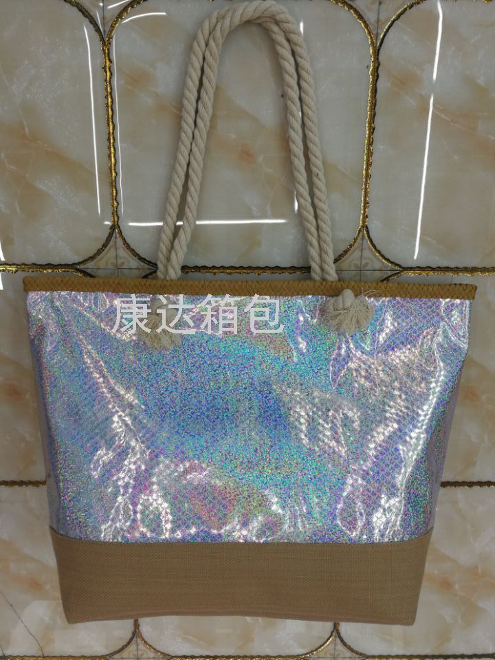 厂家直销欧美时尚大容量镭射PU防水沙滩包单肩包麻绳包