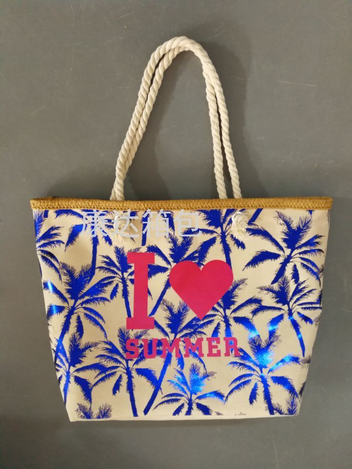 厂家直销欧美时尚大容量细麻烫金防水沙滩包单肩包麻绳包