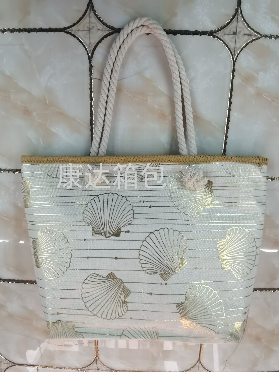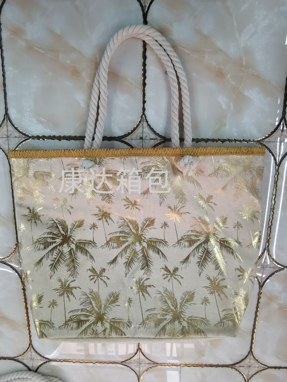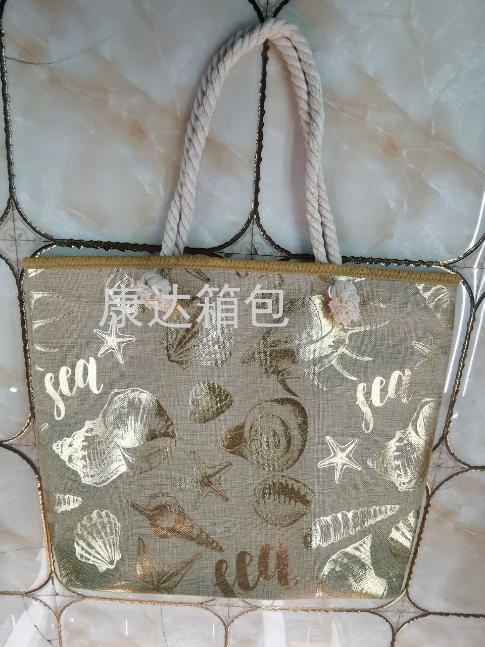 厂家直销欧美时尚大容量仿麻烫金防水沙滩包单肩包麻绳包