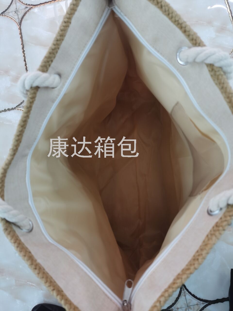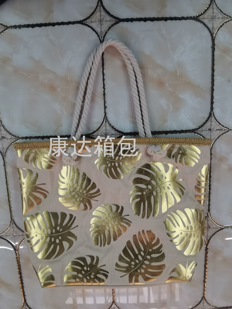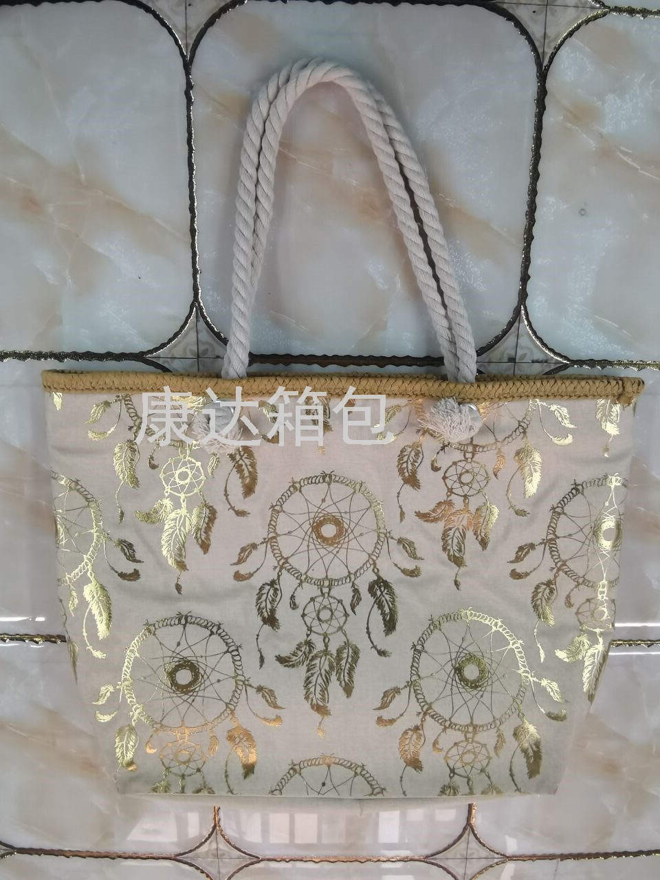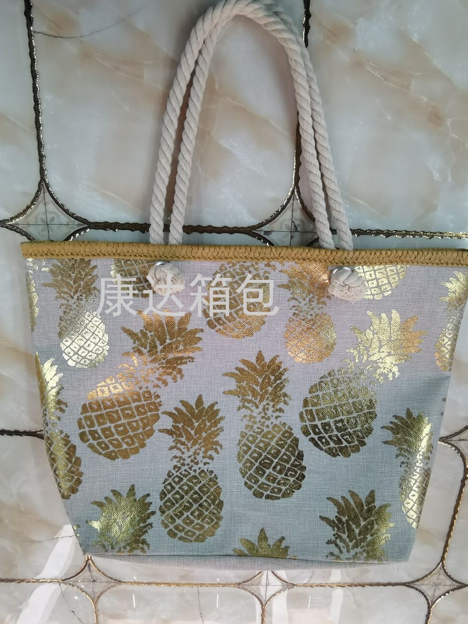 厂家直销欧美时尚大容量仿麻烫金防水沙滩包单肩包麻绳包
