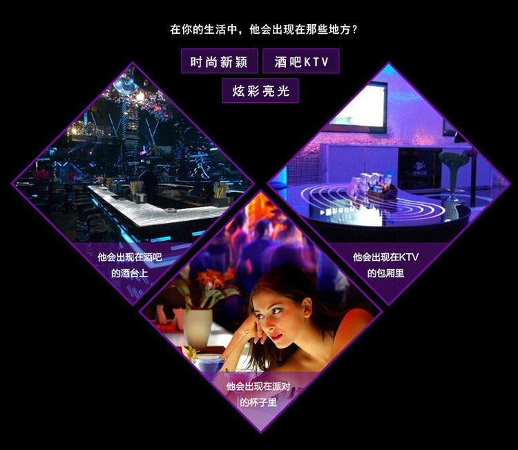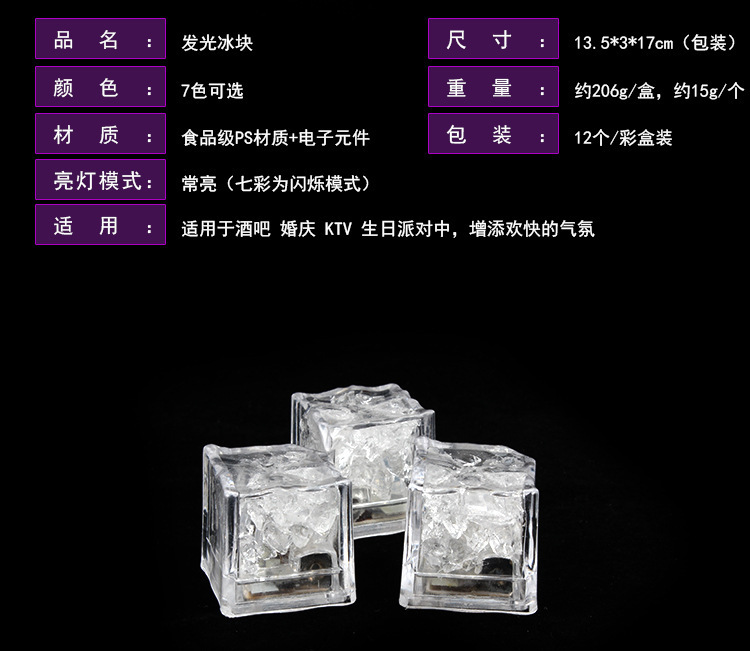 使用方法:将发光冰块清洁干净放入水中,它将自动发亮,一次性产品,