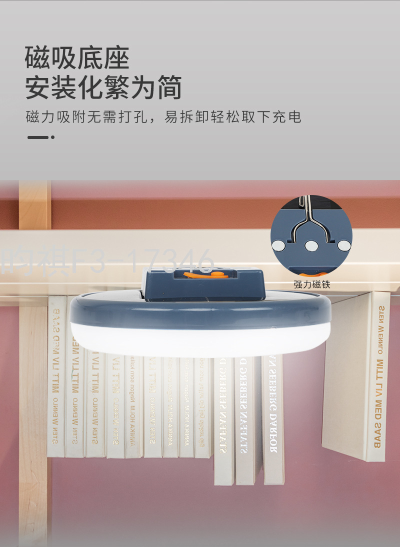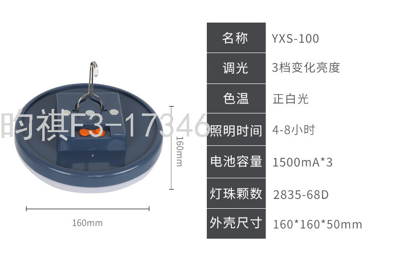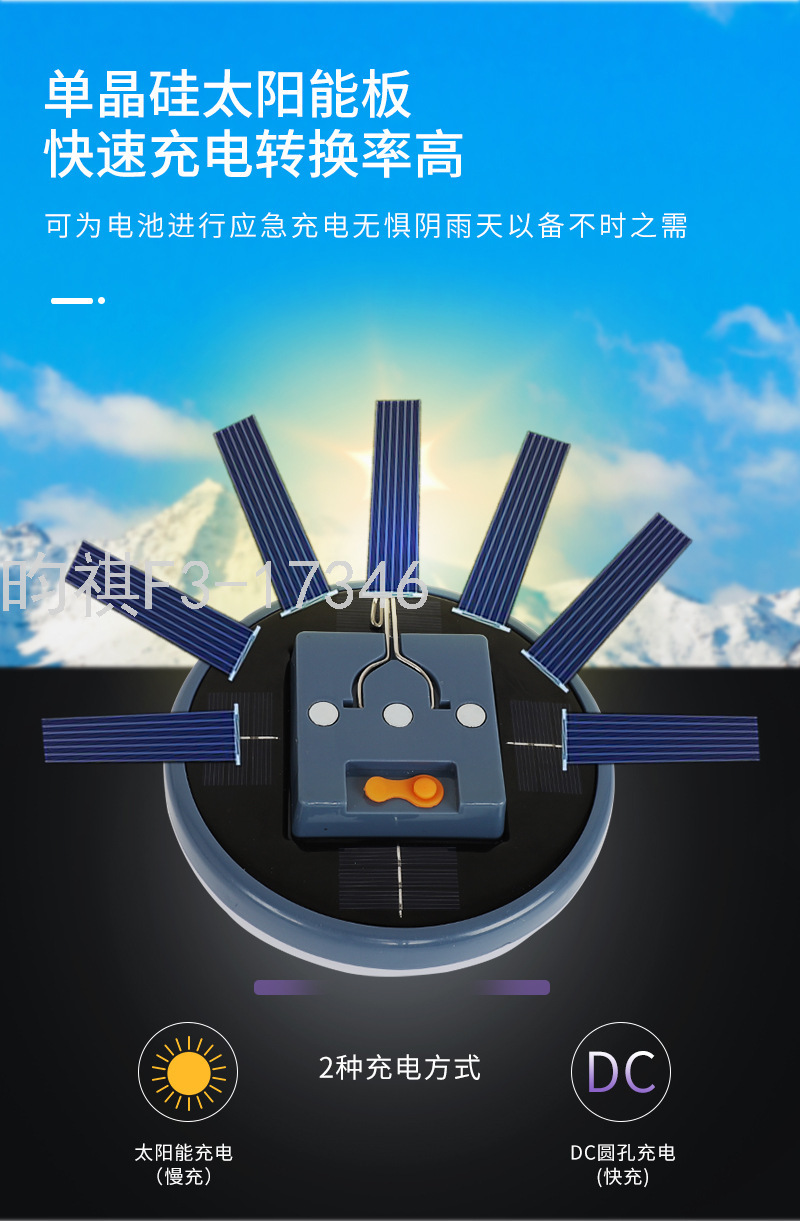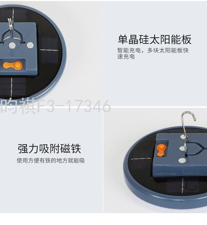 产品特点:高亮灯珠,长时间持久续航,均匀灯光,自带磁铁、挂钩,可吸或挂于任何地方三档调光:强光、普光、闪光,配0.5米USB3.5DC头充电线 ,一灯多用。恒流驱动,电流稳定输出,安全护眼,防频闪,单硅晶太阳能板,快速充电。